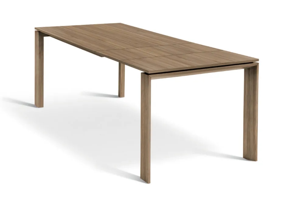 Brio is an extendable table with telescopic opening supported by four angular stained wood legs. Its streamlined and versatile design makes it suitable for any environment.