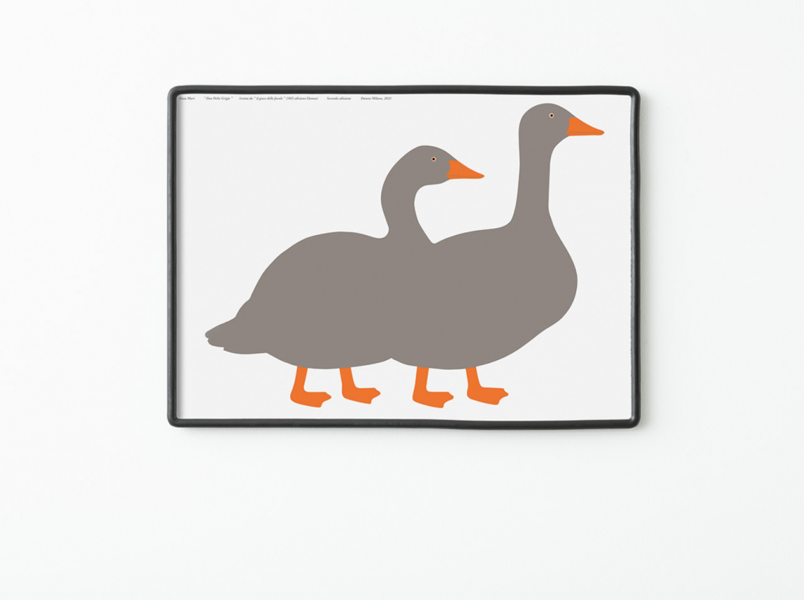 The animal subjects of the “La Serie della Natura” derive from the iconographic research that Mari developed at the beginning of the ‘60s for the definition of the characters of the “Gioco delle Favole”. A lengthy study was dedicated to each subject to achieve an emblematic result that makes an alphabet of institutionalised signs decipherable. The re-edition of the prints of Enzo Mari’s iconic subjects therefore continues with three subjects taken from this project and already created as independent prints.