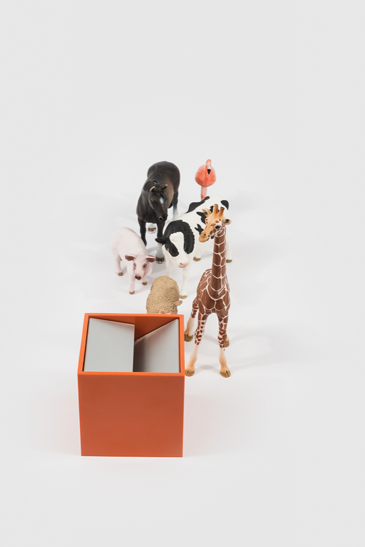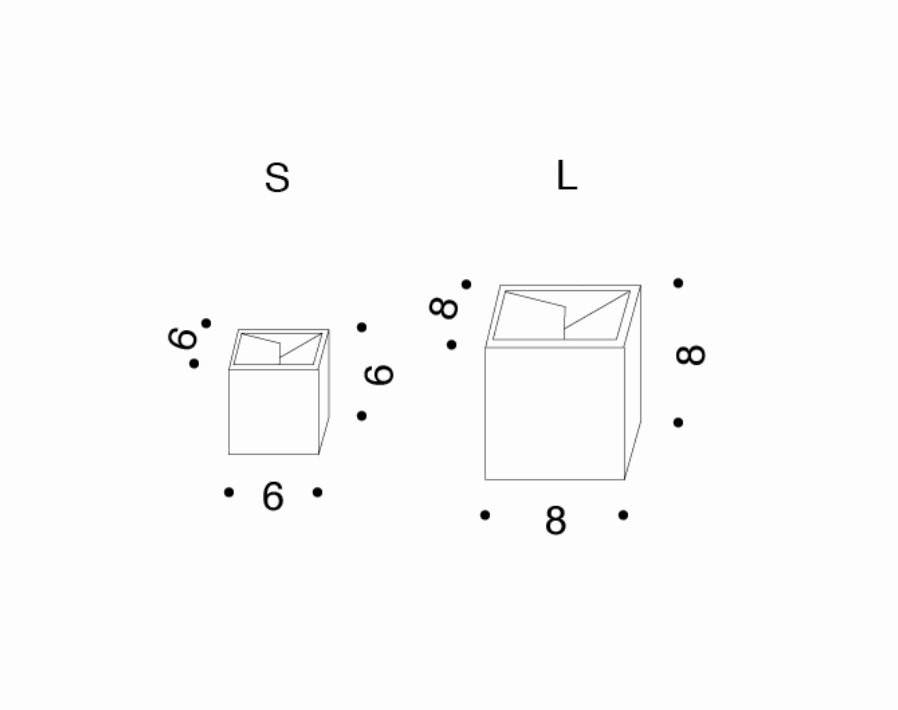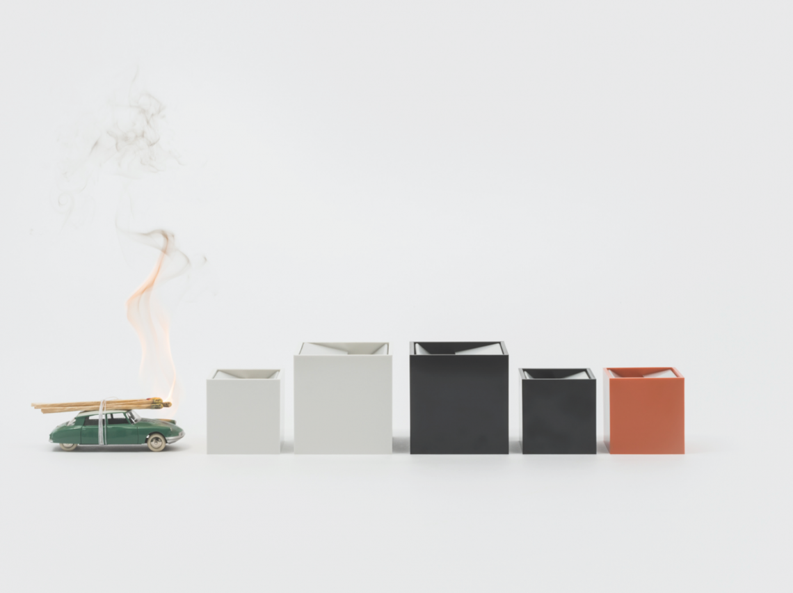 Cubo is an ashtray made up of two simple elements: a cube shaped shell open on one side contains an element made of bent sheet metal. This element is designed so that the acute angle of one end of the sheet makes the ash fall inside whilst the overlap of the other end hides the contents once inside.