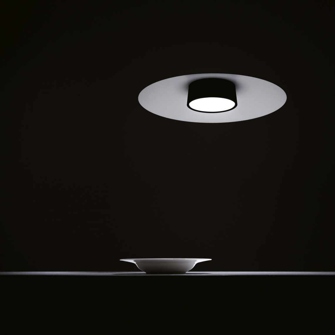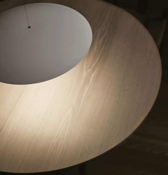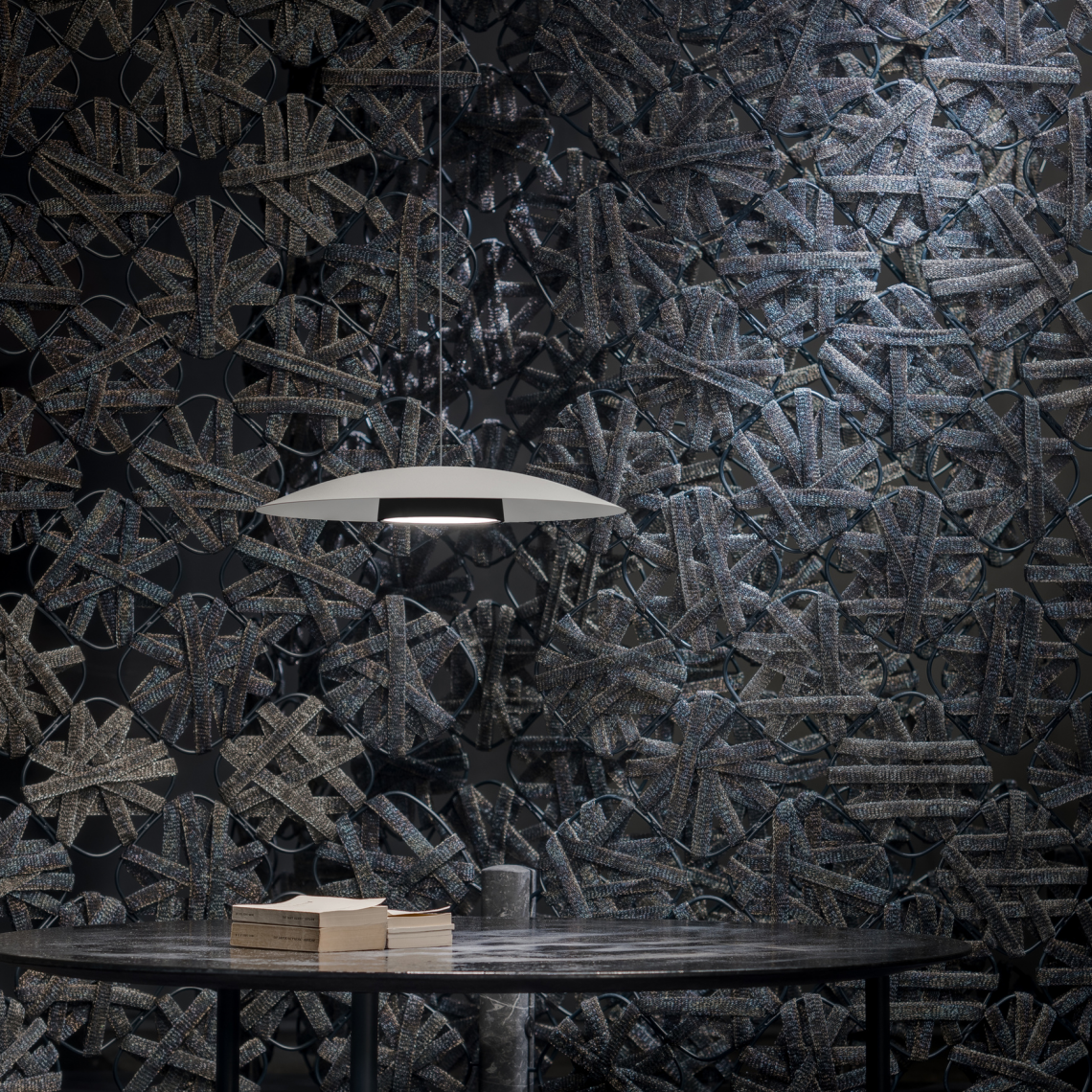 The light source is applied magnetically to a metal dish that hangs from the ceiling using a very thin steel wire. The effect is delicately elegant.