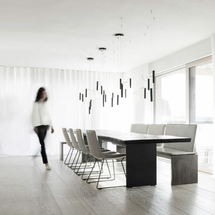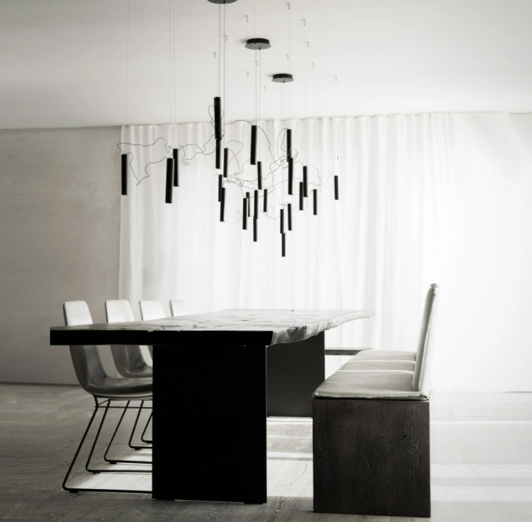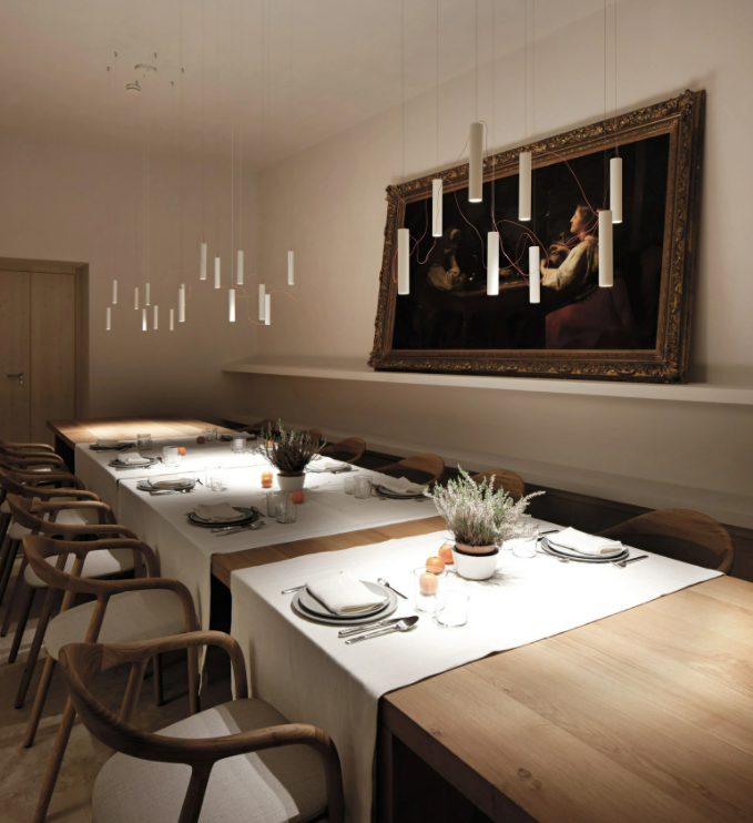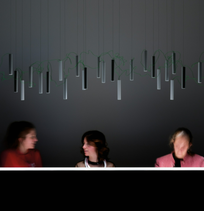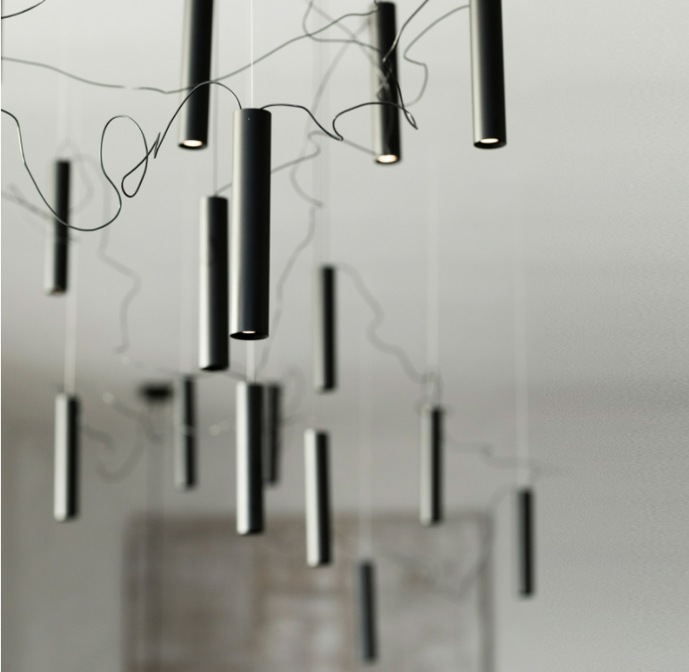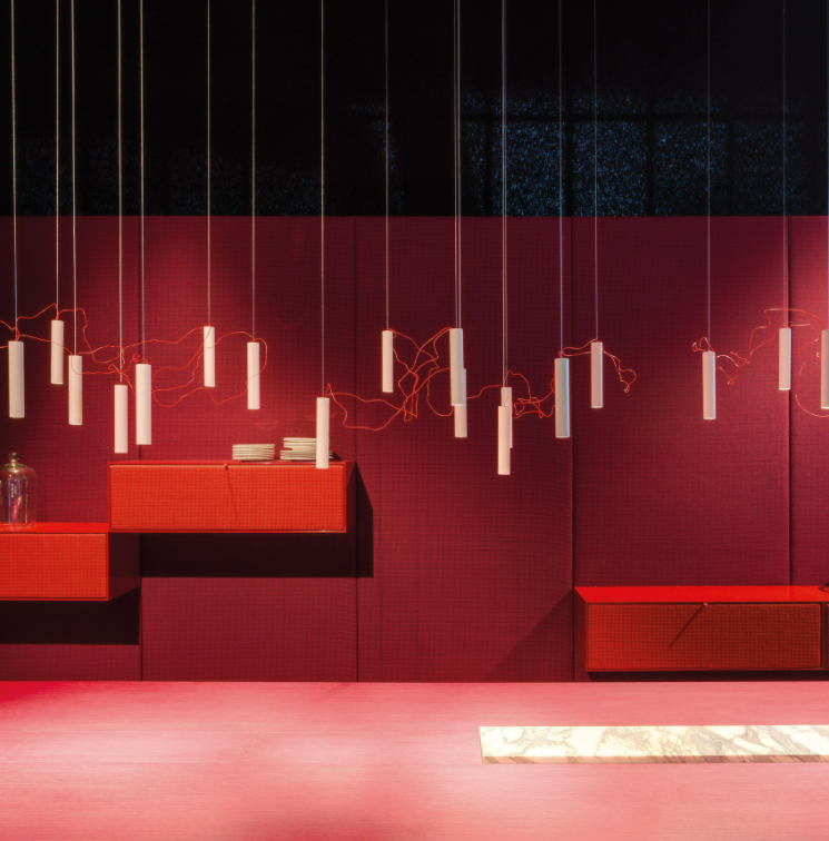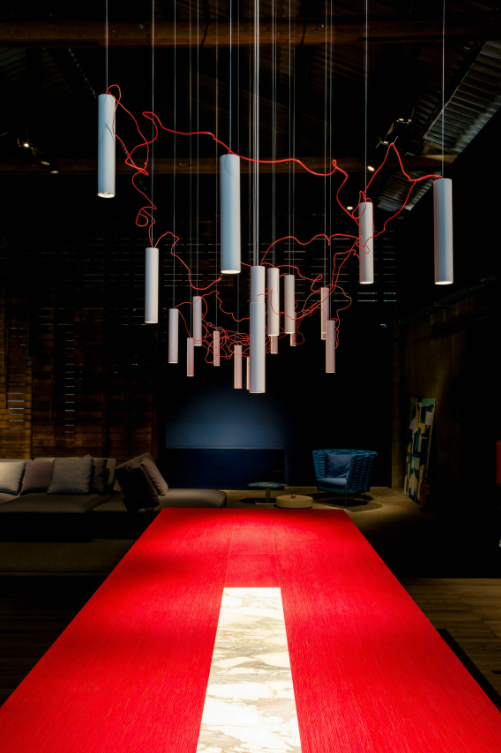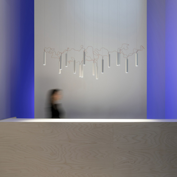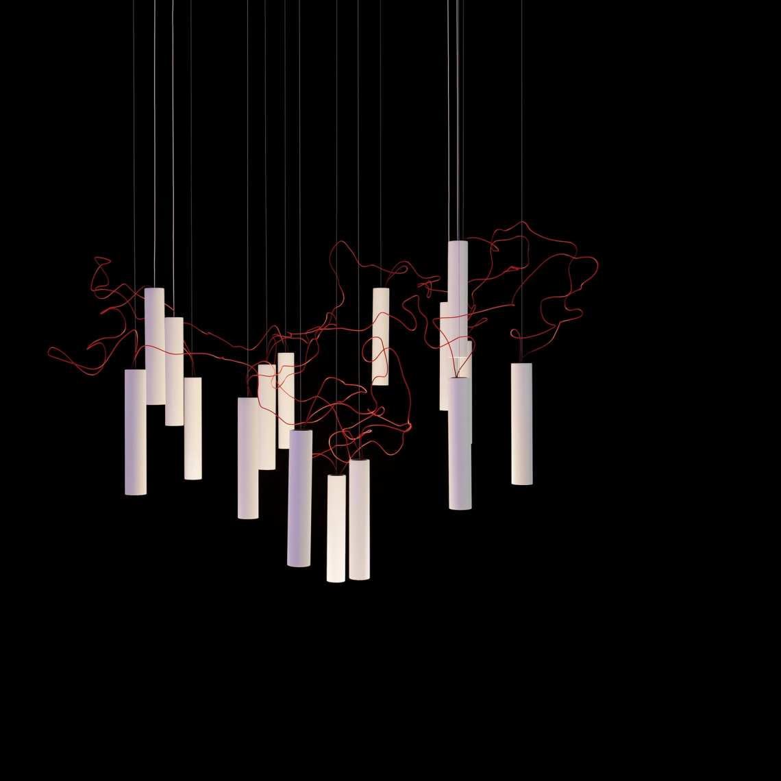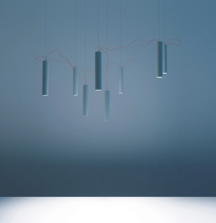 The very thin red wire that connects the light sources and brings them alive, one in relation to the other, is the principal component of this project. It represents the synthesis of our poetic vision.
