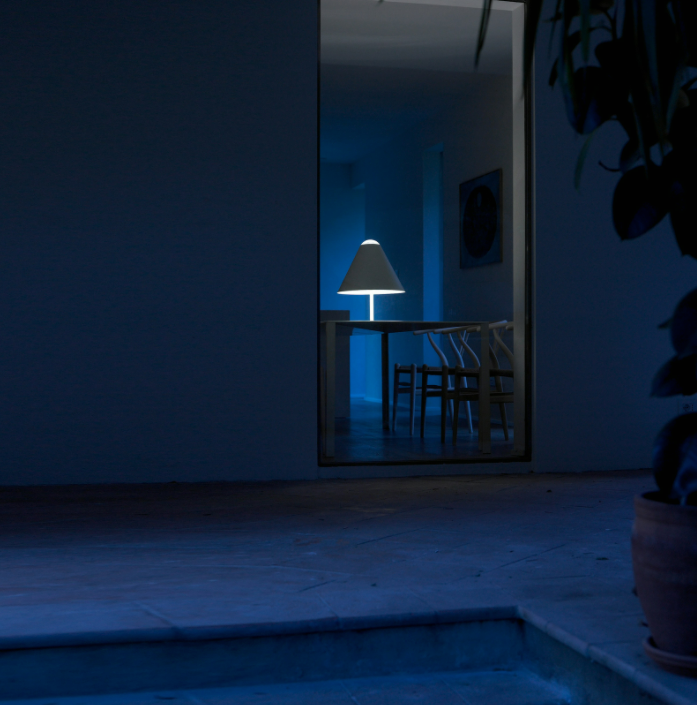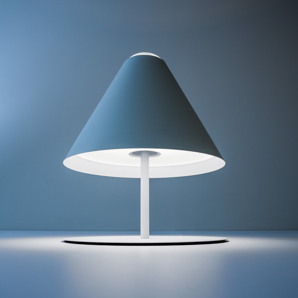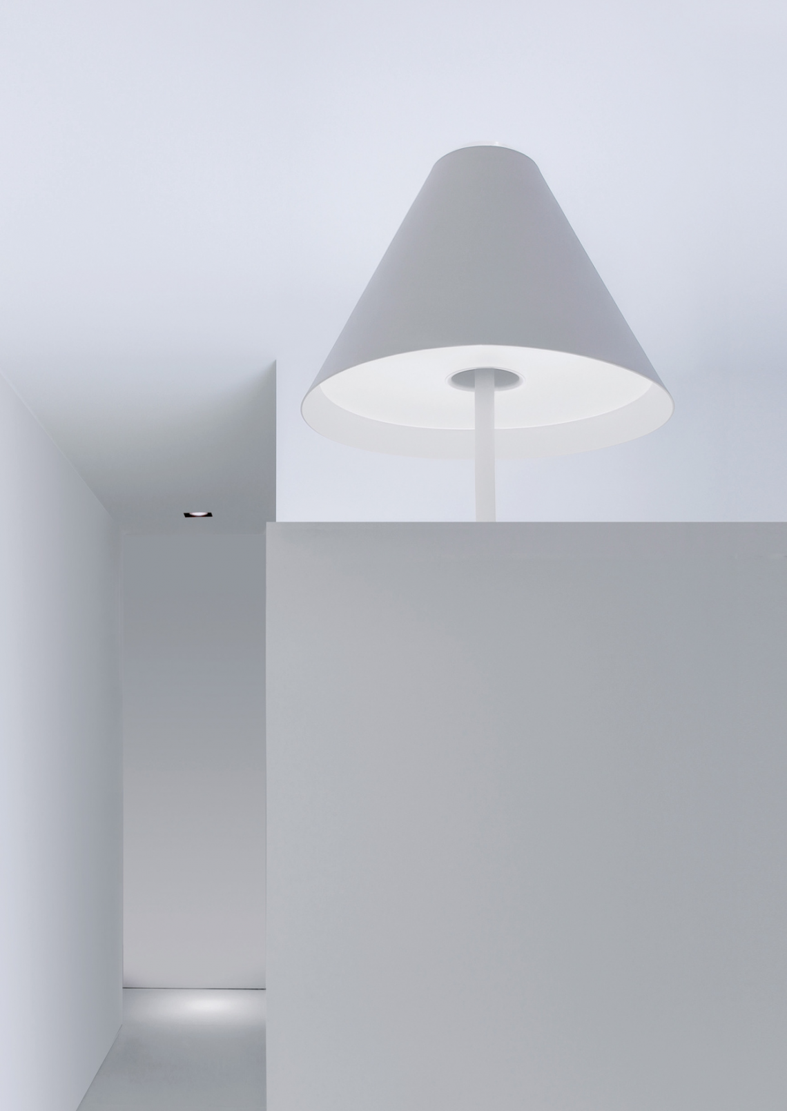 The bulb is not shielded but displayed, and it peeks out from the aluminium shade. Floor version available.