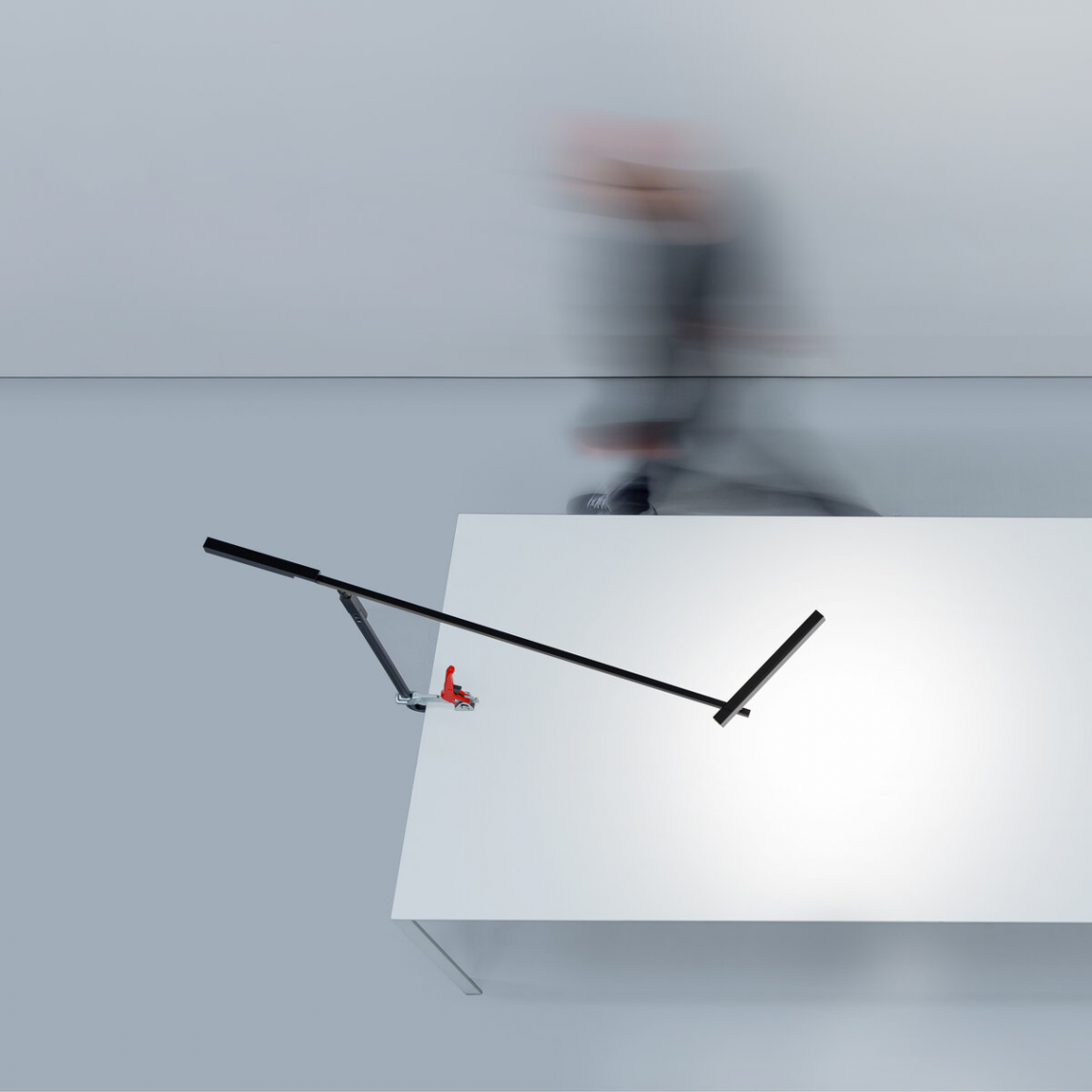 Besides being a perfect lighting tool, it is also ready-made. The oversized workshop-style clamp allows the light source to be positioned far from where the lamp is attached to the table, using three adjustable arms. A table lamp, but at the same time a very lightweight, suspended light.