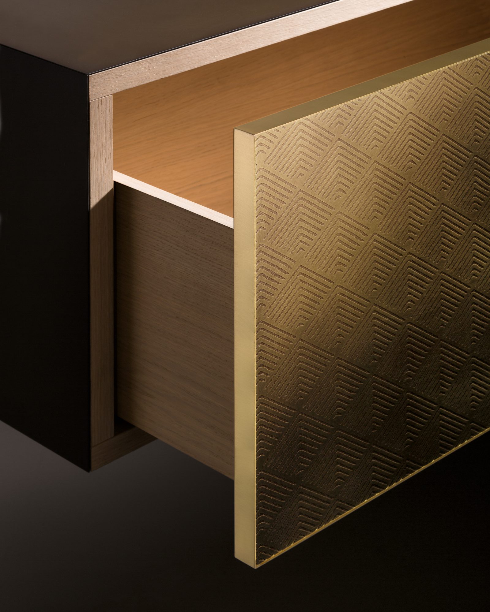 Clean volumes for a console with quite simple lines, emphasising the nobility of the metals that clad the large faces of the drawers. Available both in a hanging and free-standing version, Tako evokes the delicate decoration anointed by the DeErosion finish, for a vaguely-Japanese inspired pattern that filters light, modulating its reflections.