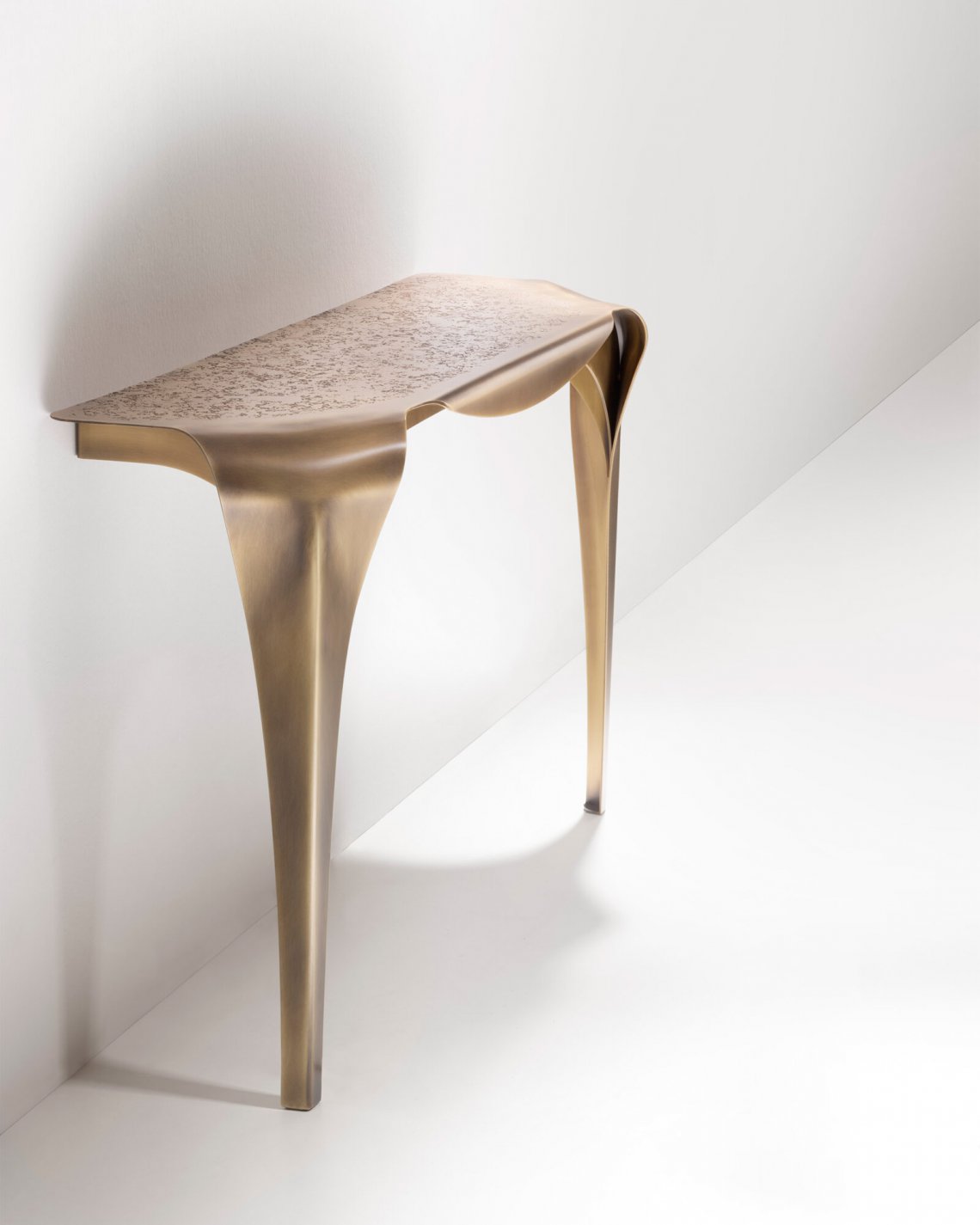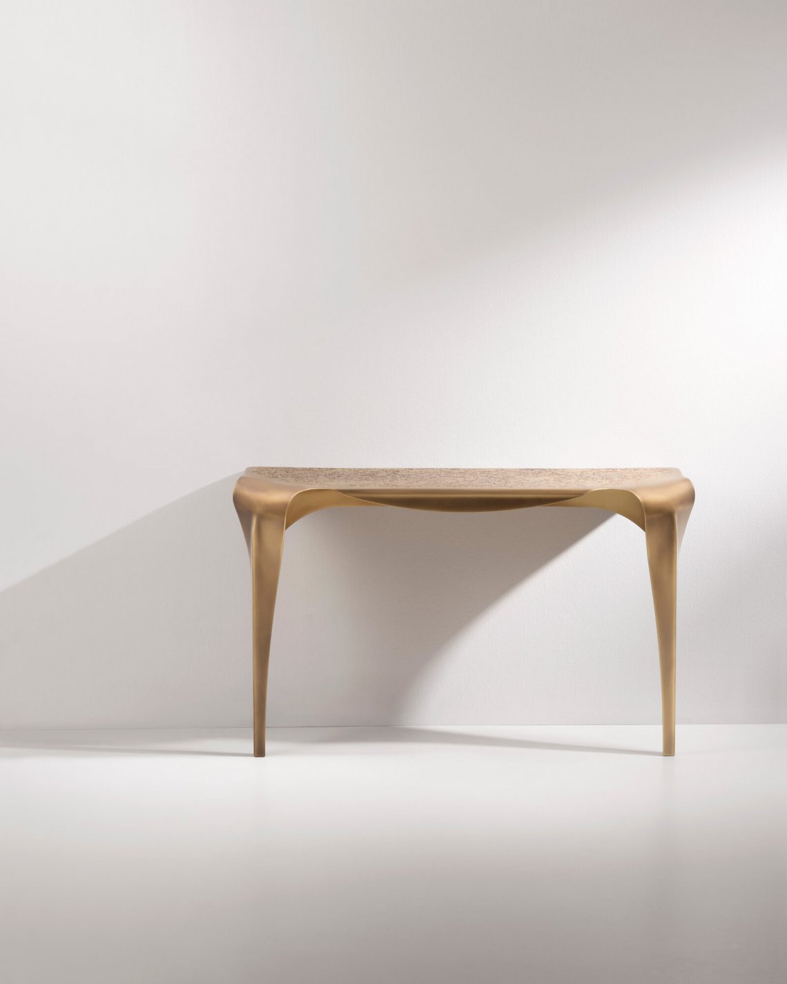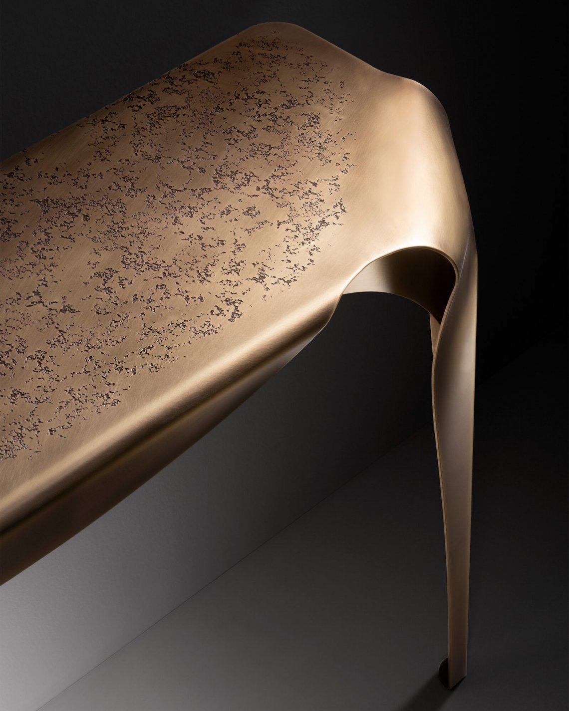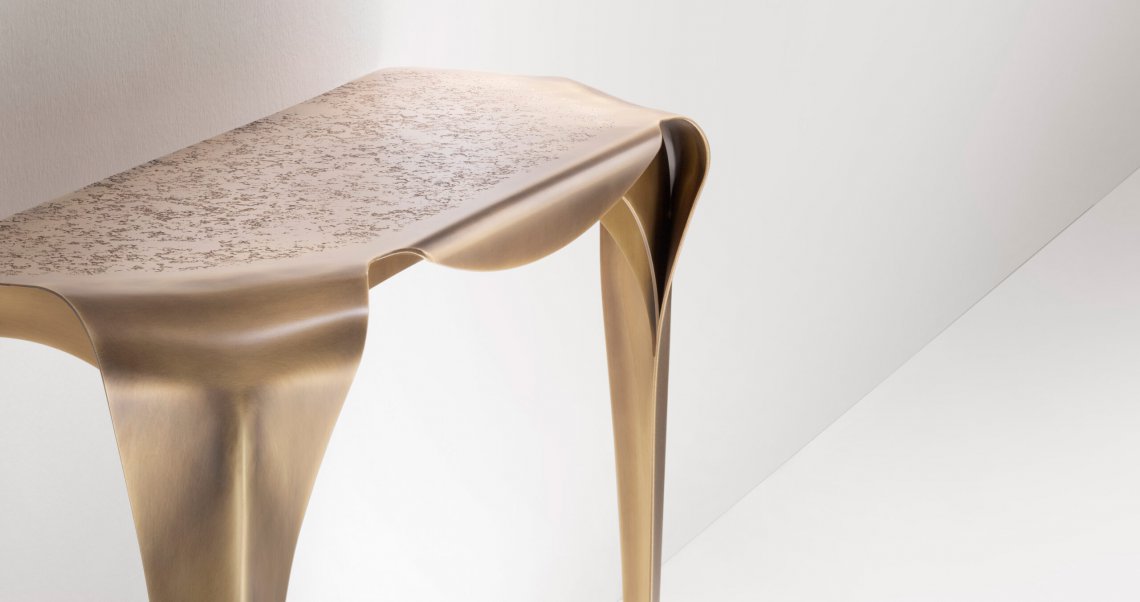 Inspired by the table of the same name, Convivium consolle leans against the wall with curvy and graceful attitude. Entirely made in brass, this piece stands out for the DeErosion finishing of the top and the flowing movement of its curved legs.