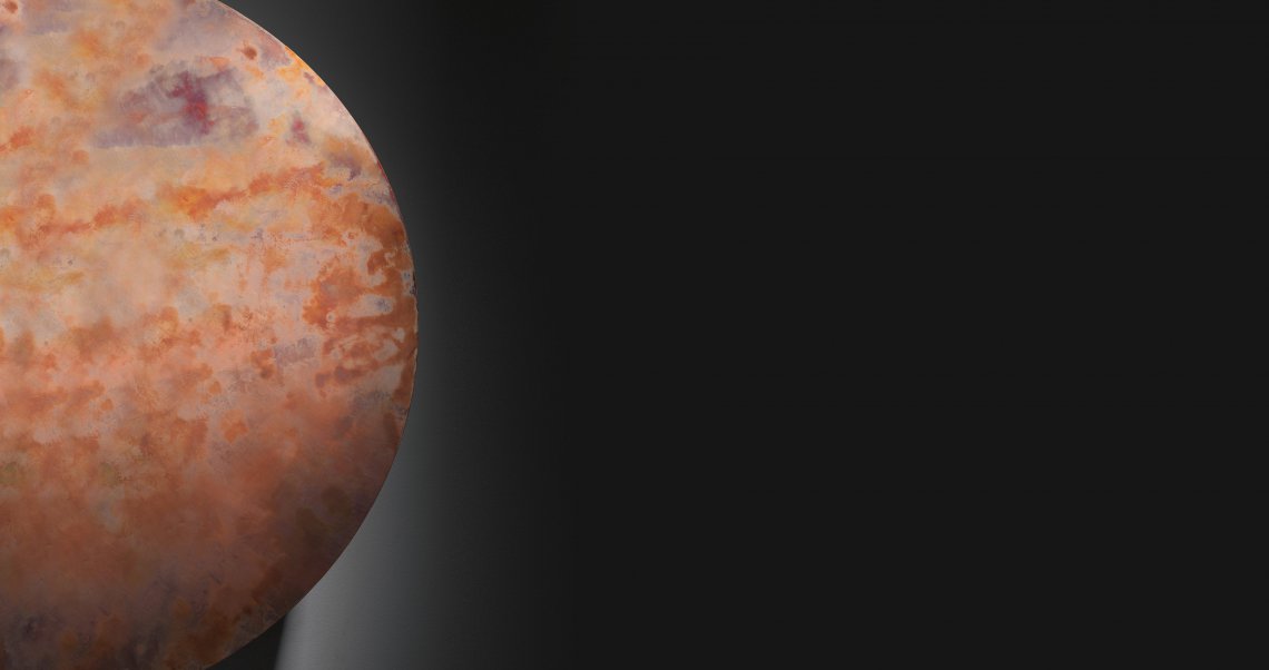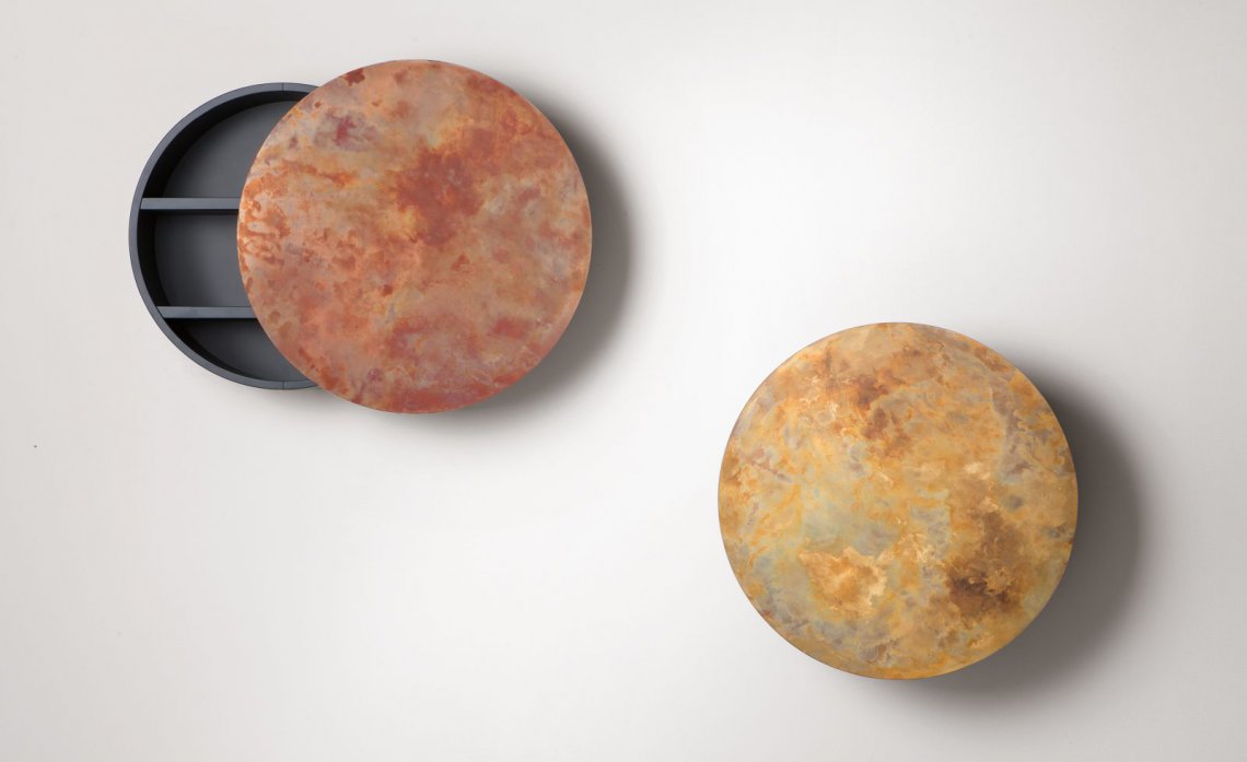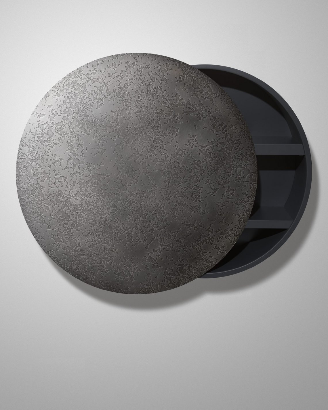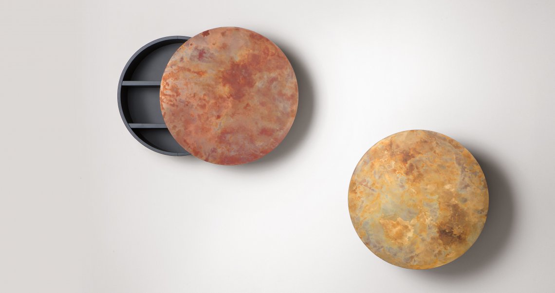 Defined by materials such as iron, copper and brass, ennobled by De Castelli finishes, Mida is a perfect circle that conceals a cabinet, to collect, contain, organize and hide objects at will. Wall-mounted like an abstract painting, it opens thanks to telescopic arms that slide the single door either right or left, becoming a celestial body that silently orbits in an imaginary eclipse.