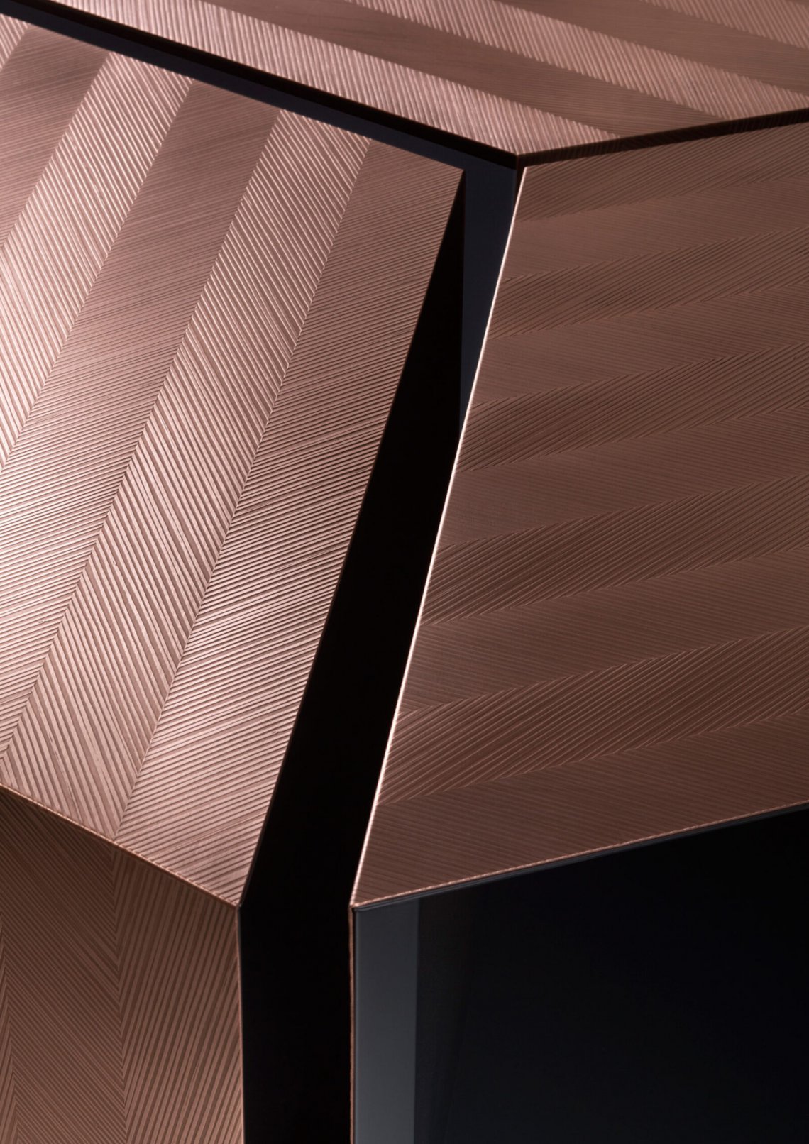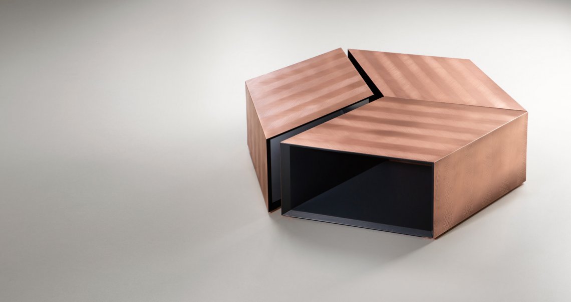 A small rhomboid-shaped table with storage space. Its simple shape renders it modular: by combining it with other identical elements, either moved around or rotated, numerous configurations can be obtained. The natural copper skin worked using the DeErosion technique creates a diagonal striped pattern that enhances the geometric shape and emphasises the graphic effect. Thanks to the measured proportions and the compositional possibilities, Alpha can fit into any environment and can be used in many different ways. The absence of surface treatment means the antibacterial properties of the copper are preserved intact.