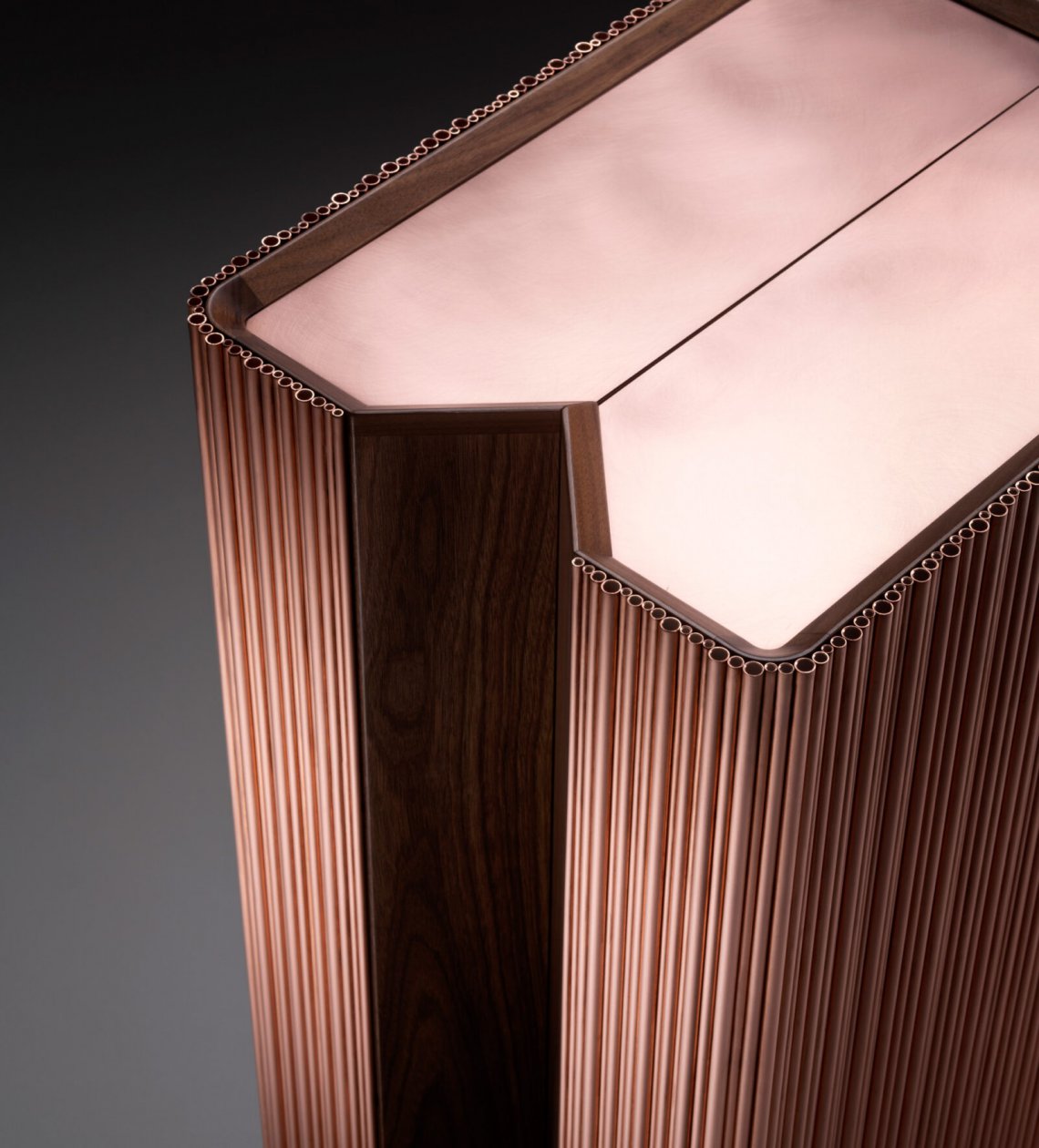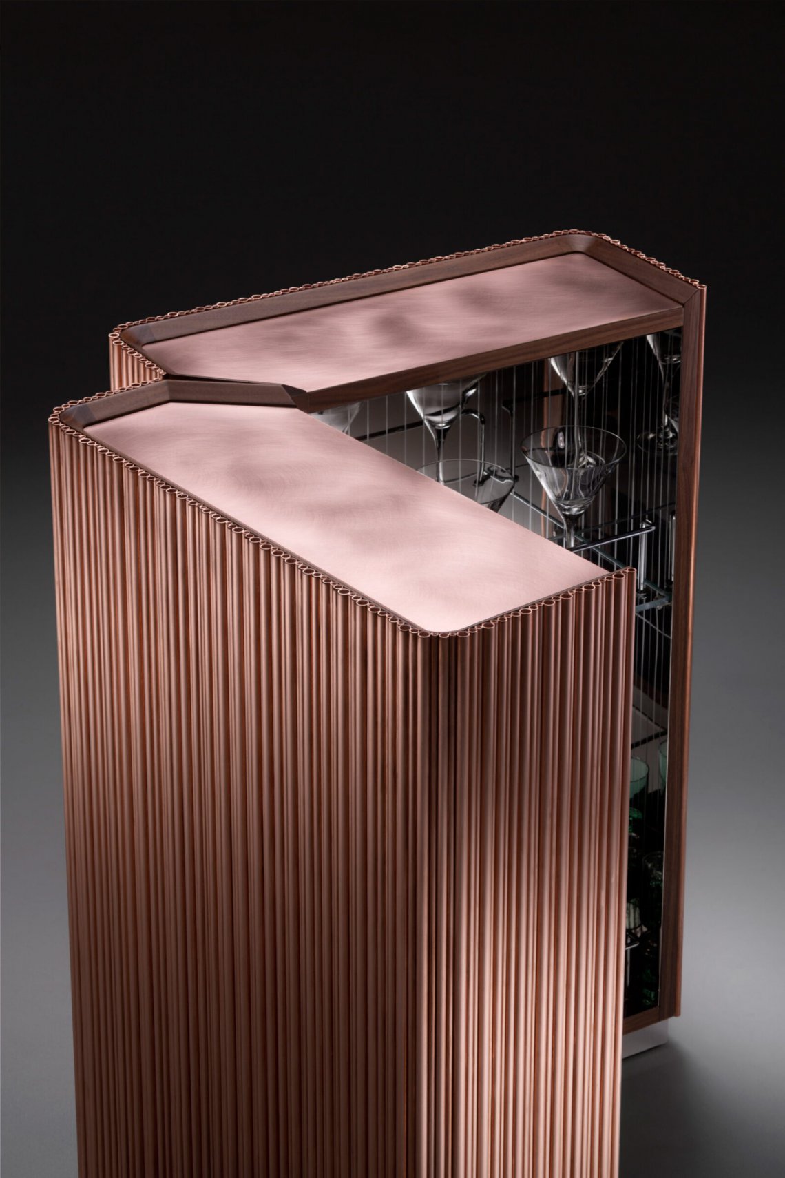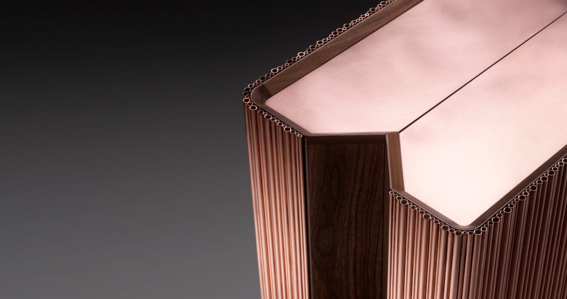 The bar, a much-loved place and symbol of sociability, enters the house, bringing with it emotions that epitomise the Italian lifestyle. Barista is a compact mobile bar with a sculptural volume, characterised by a ribbed effect comprising natural copper rods of differing diameters which create an irregular texture and give life to a soft play of light. The upper surface, also in natural copper, is slightly lower than the perimeter, thus making it useful for resting and serving drinks. The mobile bar opens like a book: the perfect 180° opening action is made possible by the design solution which incorporates a “V” shape, thus enabling the two symmetrical halves to align perfectly. The opening action is helped by two small wheels housed within the base. The interior is made entirely of stainless steel (this material was selected also because it’s hygienic and easy to clean) with a special mirrored finish, which multiplies the kaleidoscope of colours of the beverages and the reflections from the glass bottles and glasses, engendering an elegant atmosphere reminiscent of a club or café. Barista is equipped to hold bottles and glasses of different shapes and sizes.