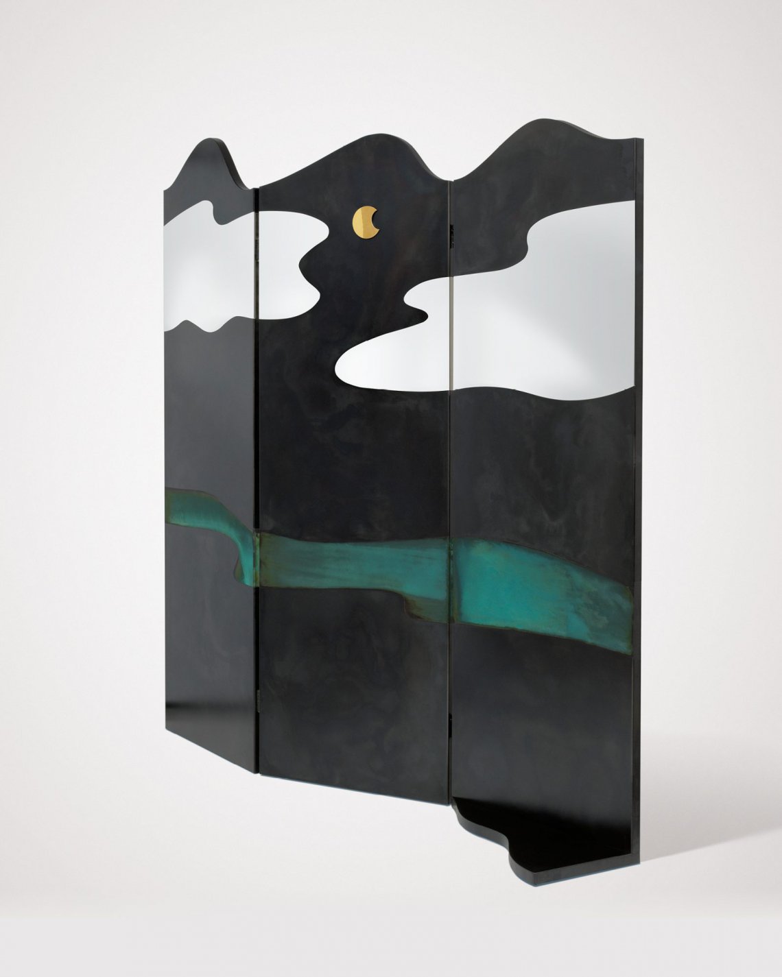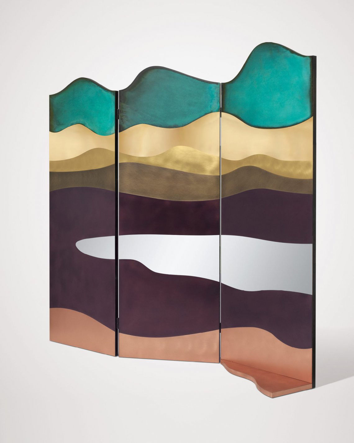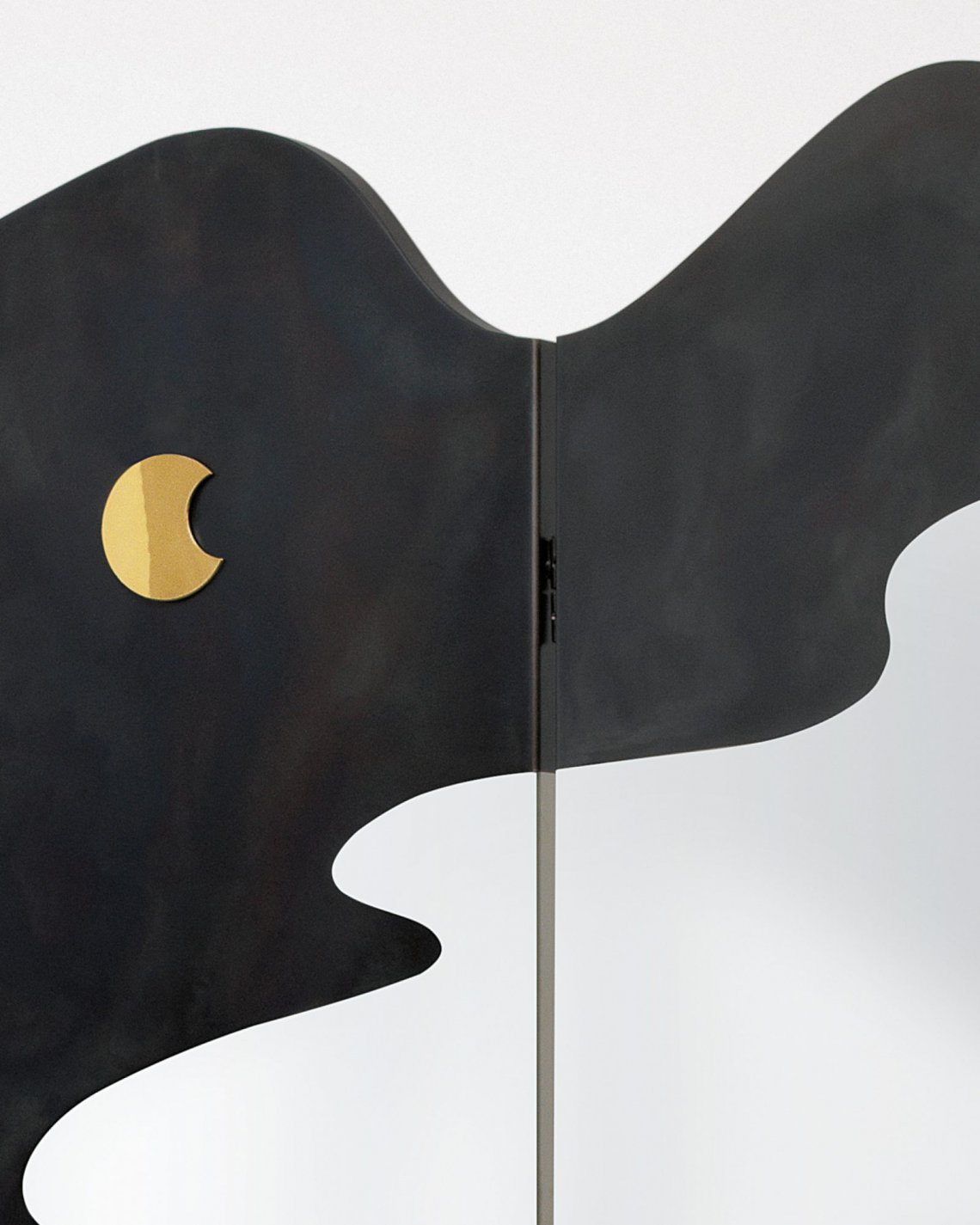A large screen designed as a theatre curtain represents imaginary natural landscapes on both sides: a night sky and the outline of a series of hills. The chromatic variations obtained thanks to the different surface oxidations resemble the colours of a painting on canvas, with the resulting image becoming a stage backdrop. Brushed copper and DeLabré brass shape the outlines of a distant space, while the textural black of the sheet metal juxtaposes with the airy verdigris in the imaginative construction of a changing landscape.