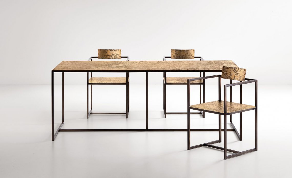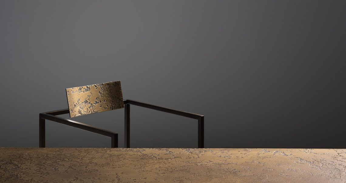 What makes this collection of minimal, geometric tables and chairs (easily adapted to any space) truly unique is the texture of their surfaces, quite evident when seen close up. Contrasting with the slenderness of the burnished steel frame, the planar surfaces are covered in brass or DeLabré copper, leaving room for surprising variations of the material, which reveals its full potential. Furniture becomes a palette, where the hand of the craftsman draws the many faces of metal.