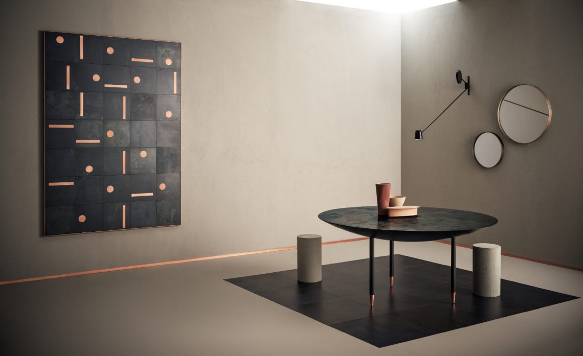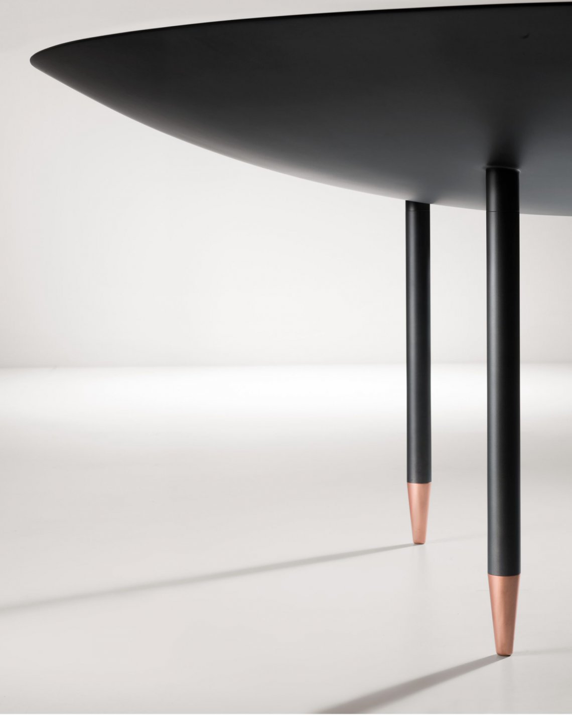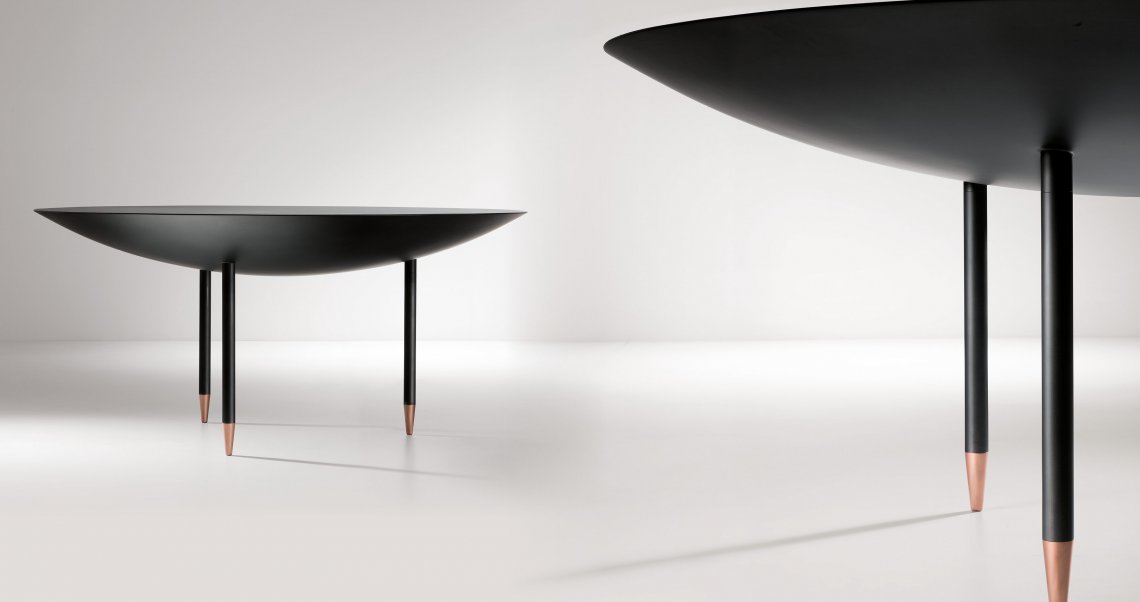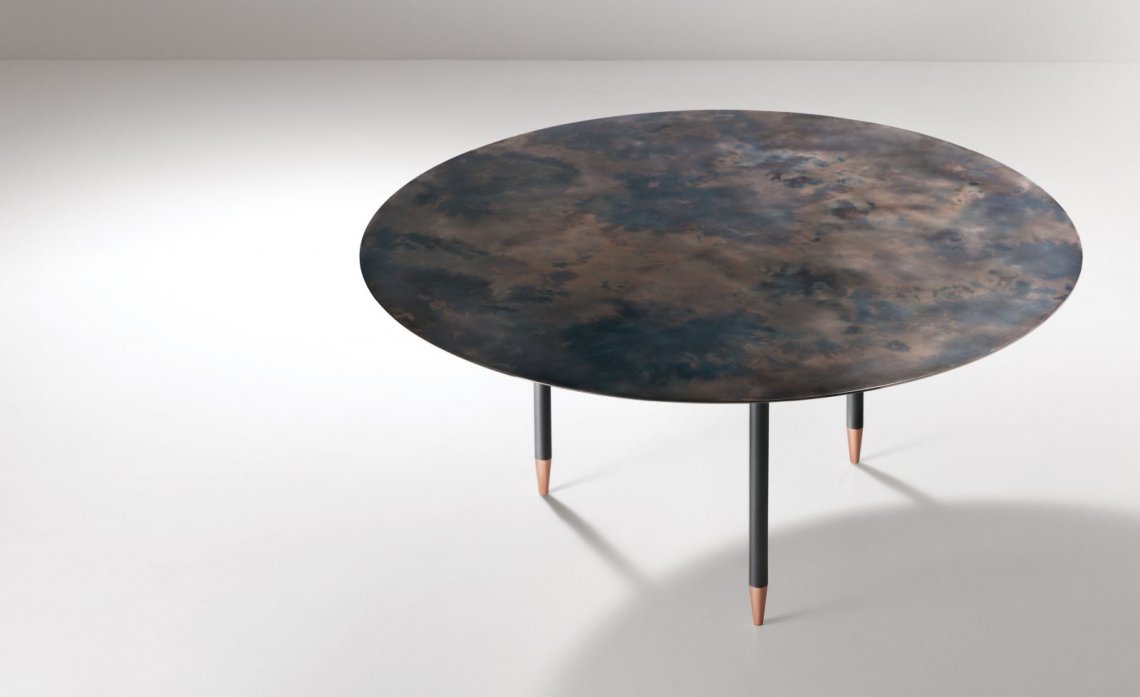 A table that interprets the round, spacious form of a brazier, which it echoes in its size and volume. A symbol of sharing and communion that references the ritual of conviviality and spending time together. The top, in generous proportions, and the lower ‘lens’ fuse into a single piece, into which three legs are inserted. The personality of this sculpture-table arrives via the iridescent finish of the top, the memory of always-glowing embers, and the luminosity of the copper feet upon which the legs rest, lightening our perception of the whole.