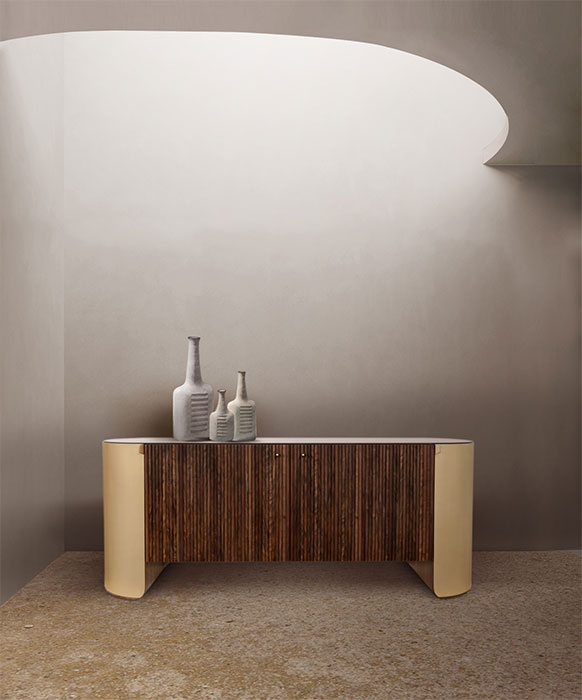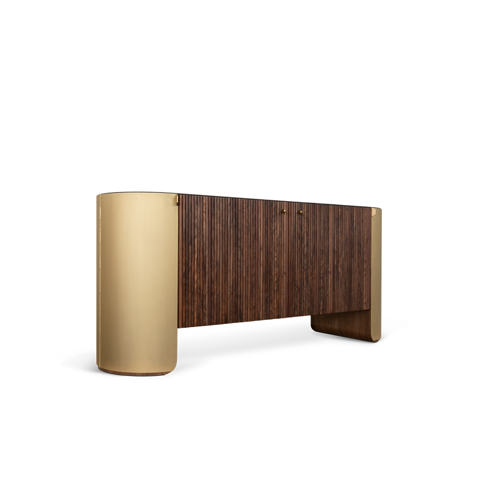 Combining the best of mid-century and Italian design excellence, the Duncan sideboard reinvents the 60s charm in a unique way. The curved lateral metal structures support and hug the body of the side doors, while the main storage space is enhanced with a geometric wooden pattern that adds another layer of texture. High-quality materials and exquisite craftsmanship make this an exceptional statement piece for any modern home design.