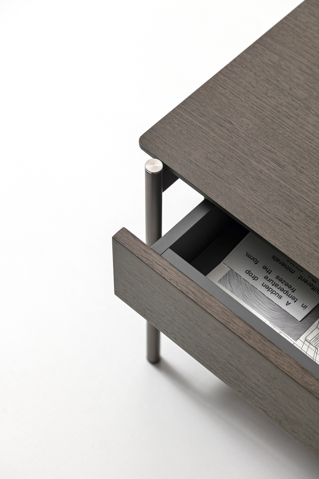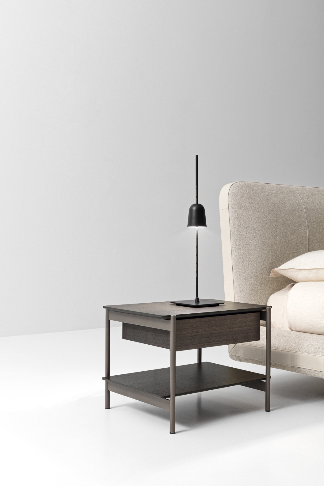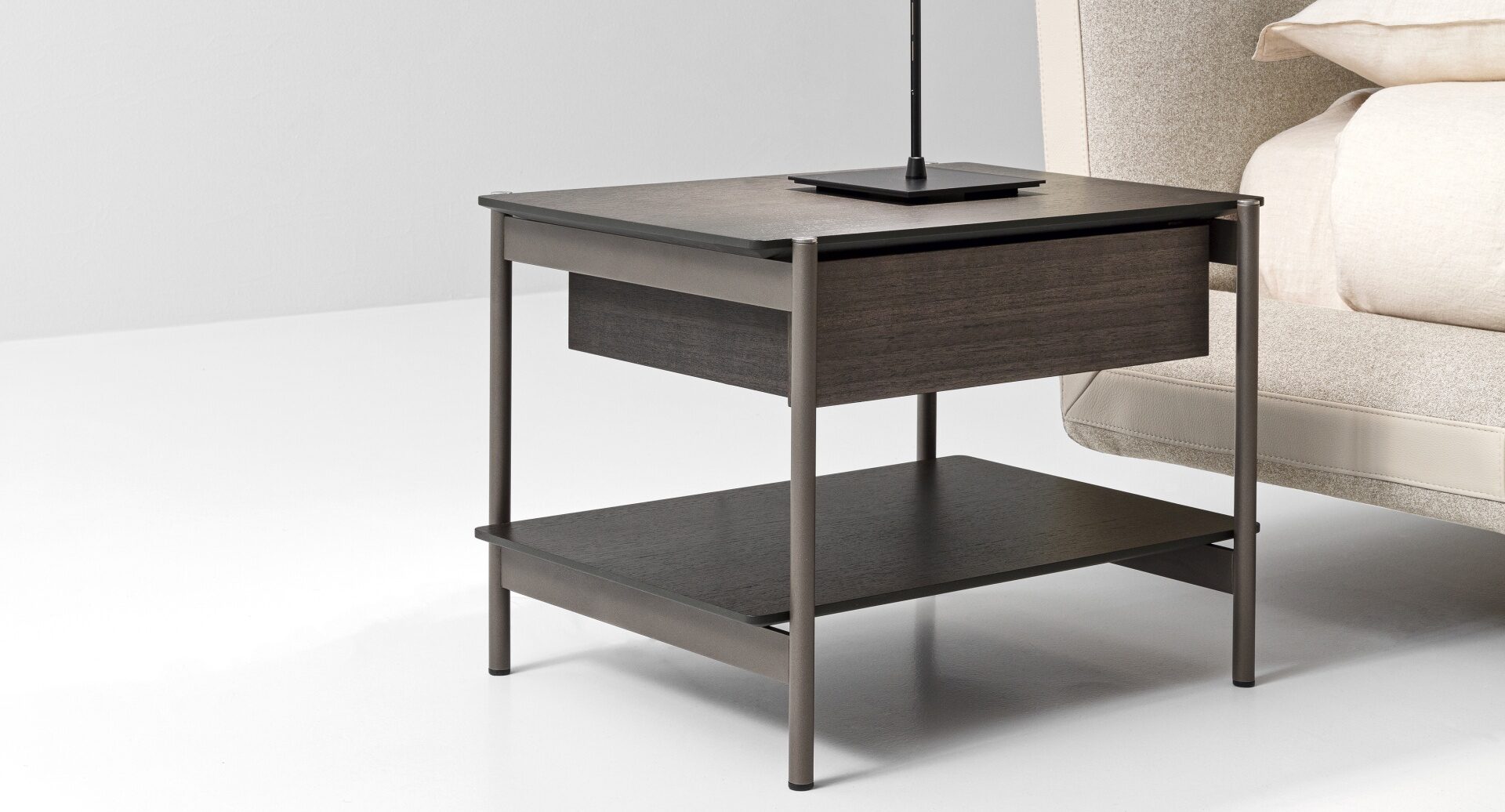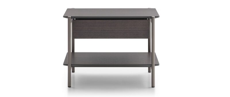 Uno slanciato telaio in metallo incontra due sottili piani in legno per originare un comodino elegante, sobrio e minimale nell’aspetto, funzionale e flessibile in quanto a utilizzo e ambientazione nella zona notte.
