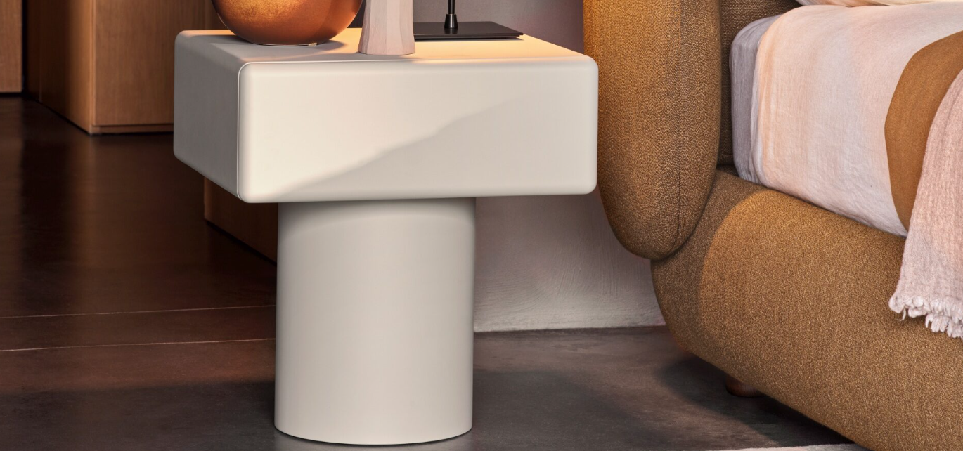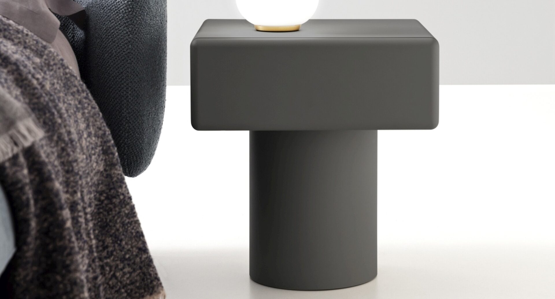 Grazie all’accostamento puntuale di due forme essenziali nasce un complemento che arricchisce con grazia la zona notte. Una colonna esile e al contempo stabile sostiene un pratico cassetto, a simulare l’effetto inatteso di un vassoio di servizio.