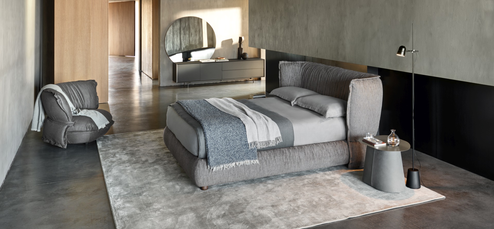 Un binomio di arredi per la zona notte. Un letto la cui generosa testiera rimanda all’idea – e alla forma – di un soffice guanciale; e un comodino che, per contrasto, risalta nella sua forma rigorosa e disciplinata, dettata da un piano di metallo e da una solida base rivestita di pelle oppure tessuto.