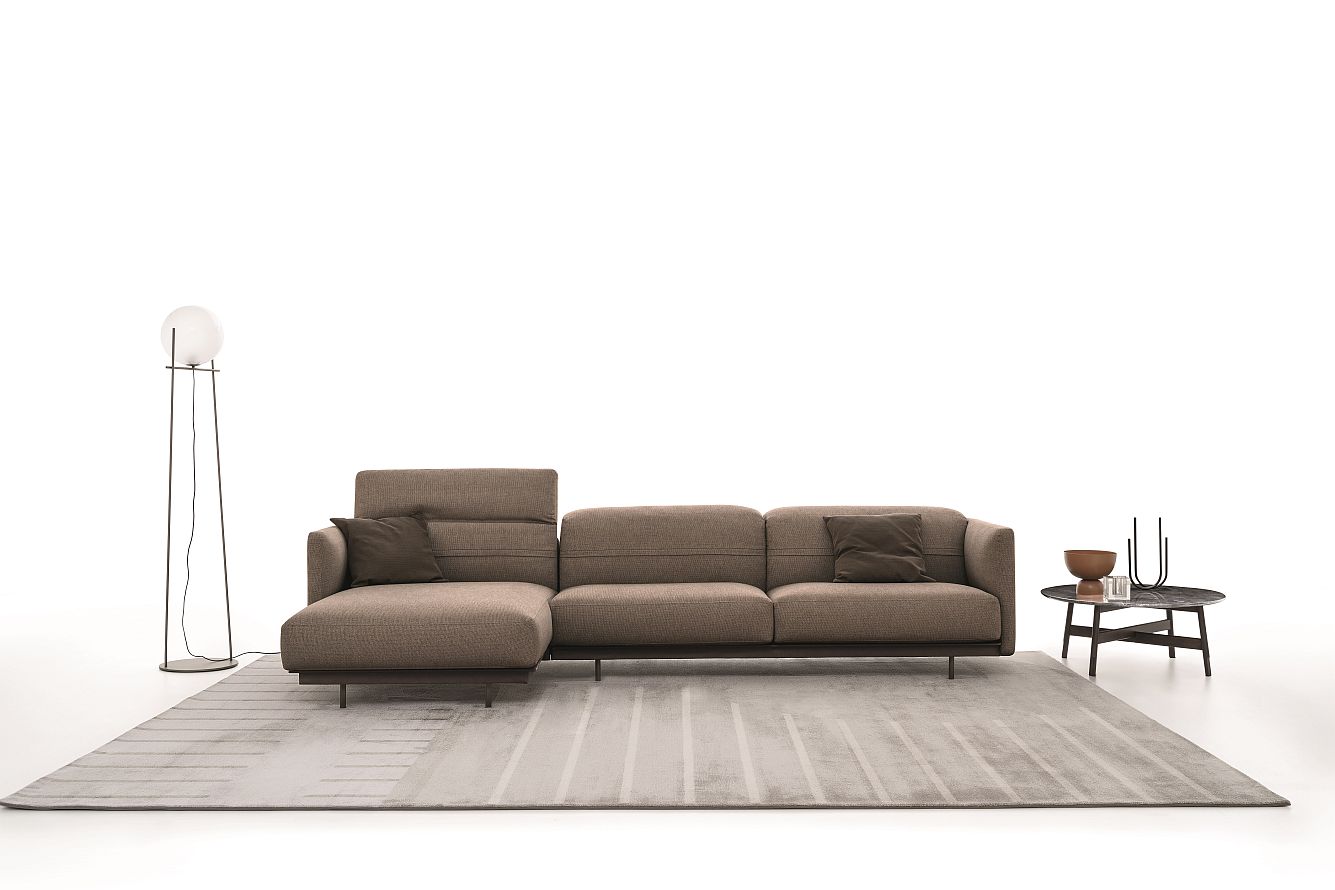 沙發(fā)的水平結構以側邊細薄的扶手為邊界,這些扶手也是沙發(fā)不同版本和配置的特色。畫面勾勒出簡約而嚴謹?shù)沫h(huán)境,可調節(jié)靠背的運動令您可完全放松,閱讀,交談…總之就是享受生活。沙發(fā)備有兩種版本:一種帶有落地式座墊,另一種由纖細底腳支撐,配有金屬底架,金屬采用外覆真皮或烤漆飾面。直排和轉角沙發(fā),備有固定式和組合式兩種,打造無與倫比、經(jīng)典永恒的陳設。
