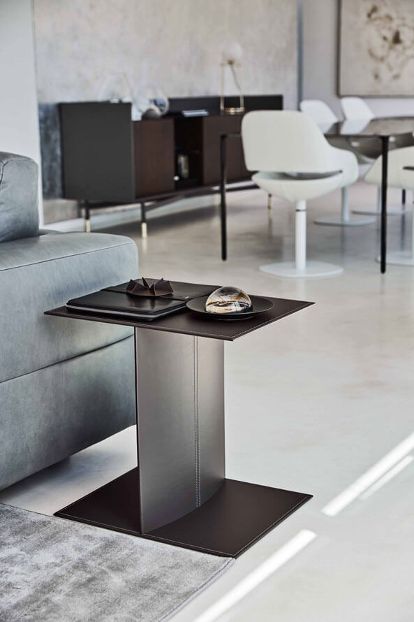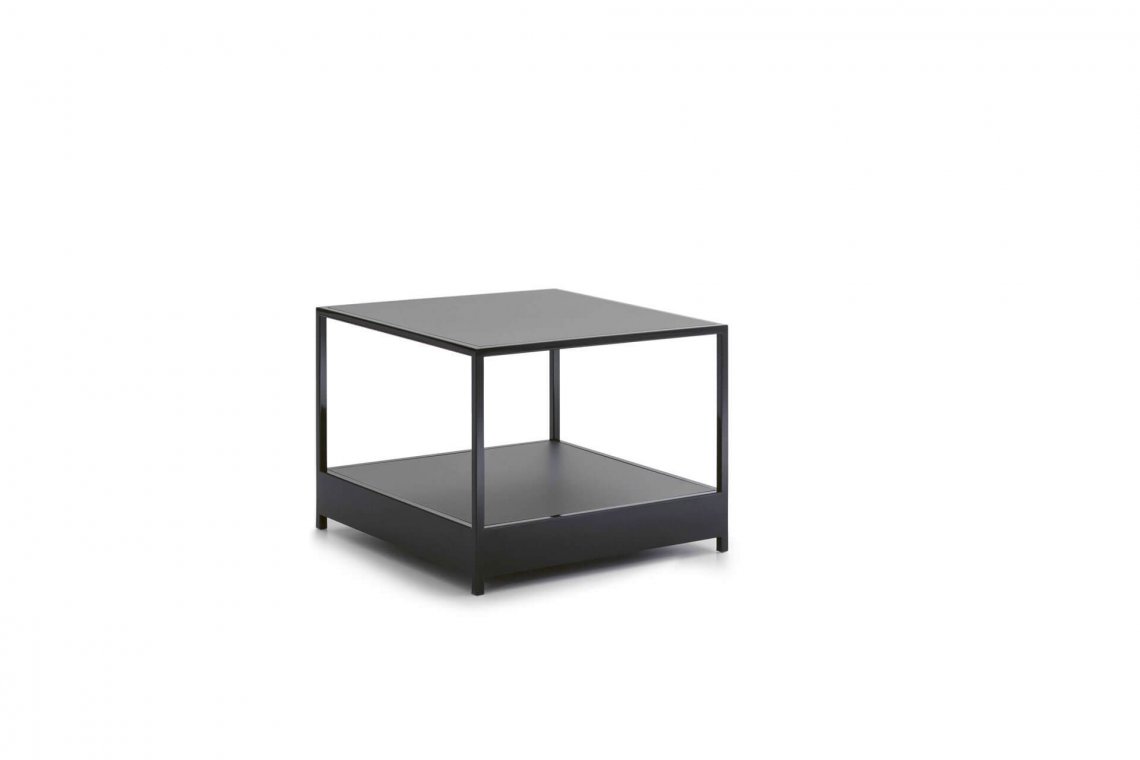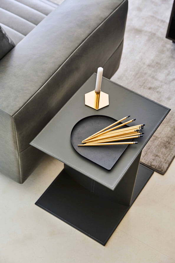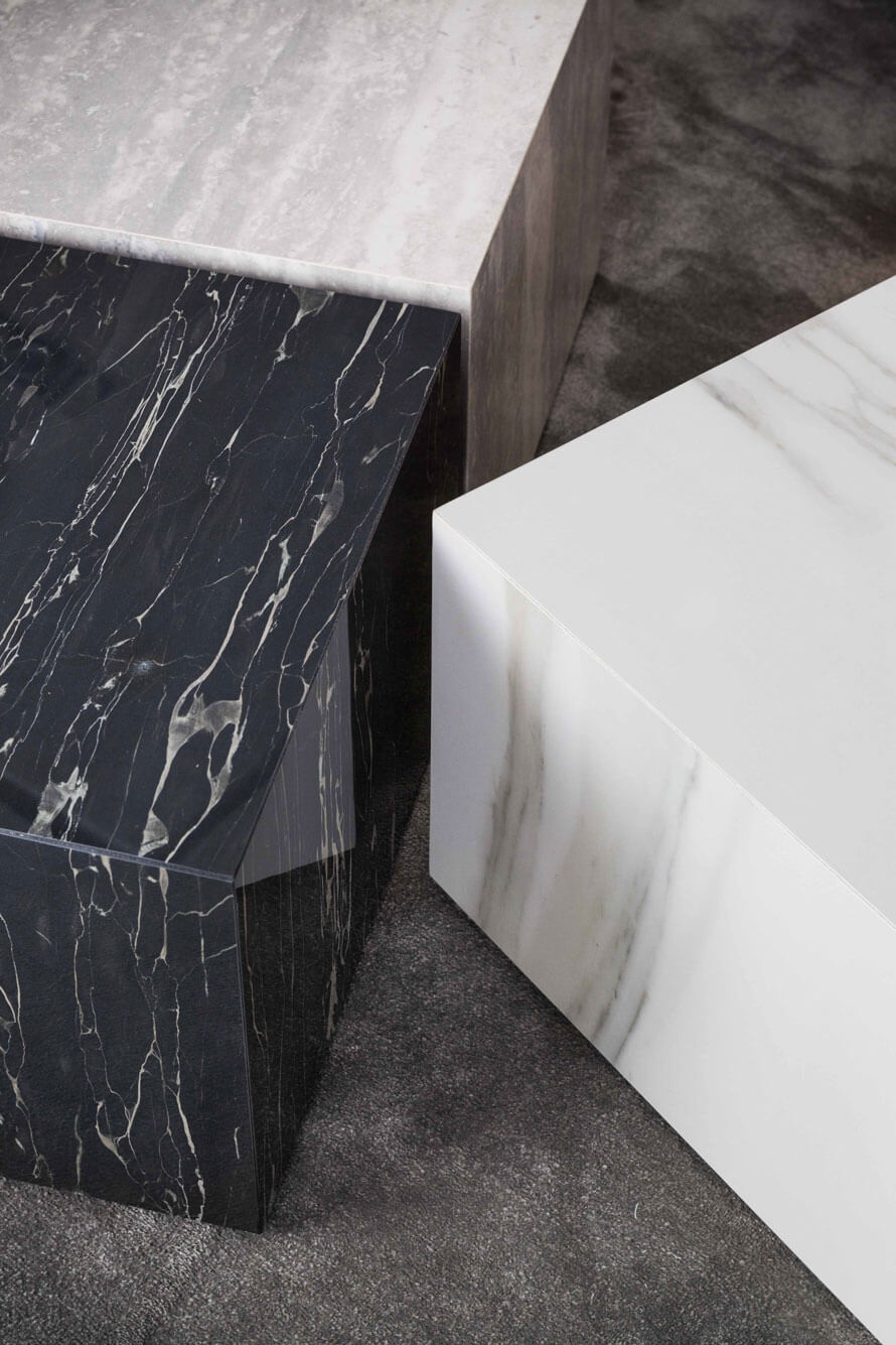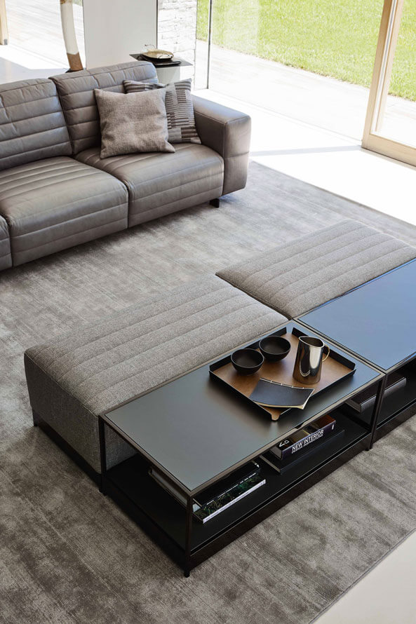 Bag si completa con una serie di tavolini, e cubi in stone-gres che si registrano con le modularità dei componenti imbottiti.
