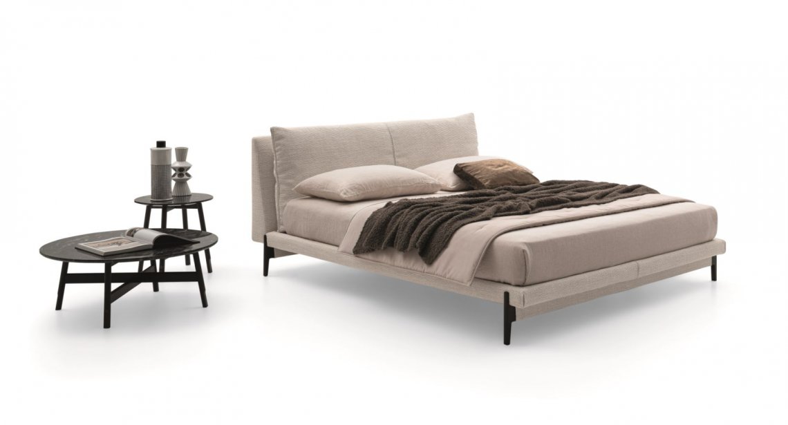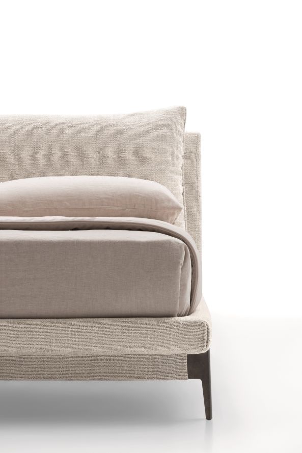 Kim letto riprende le eleganti e caratteristiche linee dell’omonimo divano, riconoscibili soprattutto nello schienale e nel giroletto. Una struttura equilibrata, con rivestimento in tessuto, pelle o mix, personalizzabile con una delle due versioni di piedino esclu
