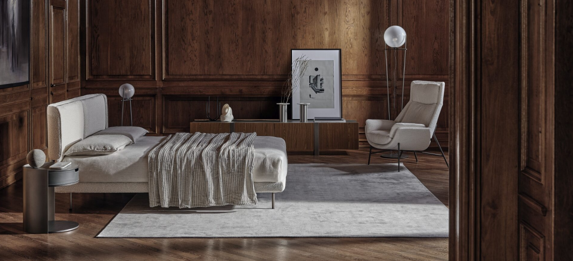 L’accogliente testiera si traduce in un sobrio abbraccio per un letto contenuto nelle dimensioni di ingombro. Il carattere leggero ed essenziale diventa il segno distintivo di Skin.