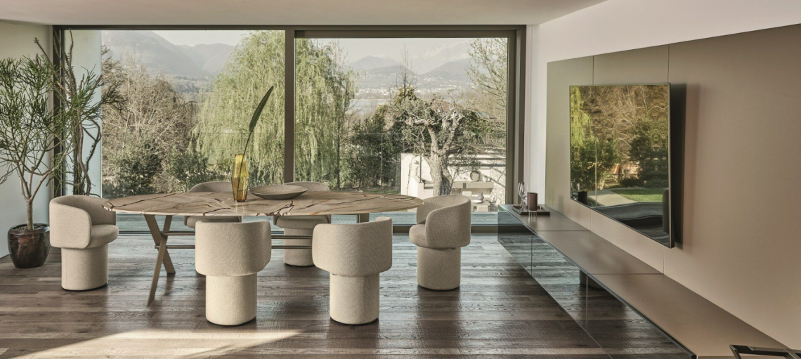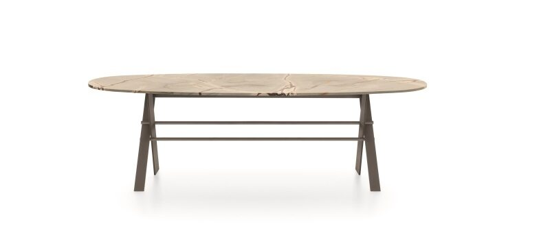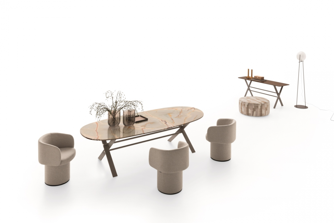 Segno iconico e primordiale, l’incrocio a X caratterizza il tavolo e la consolle XCS. Due fianchi disegnati dall’accostamento di piatti metallici sottili ed inclinati, collegati da una trave longitudinale a doppio tubo circolare. Una struttura dal disegno forte, esaltata da dettagli e finiture ricercate, che sorregge piani di varie dimensioni e forme, in legno, vetro o pietra naturale.