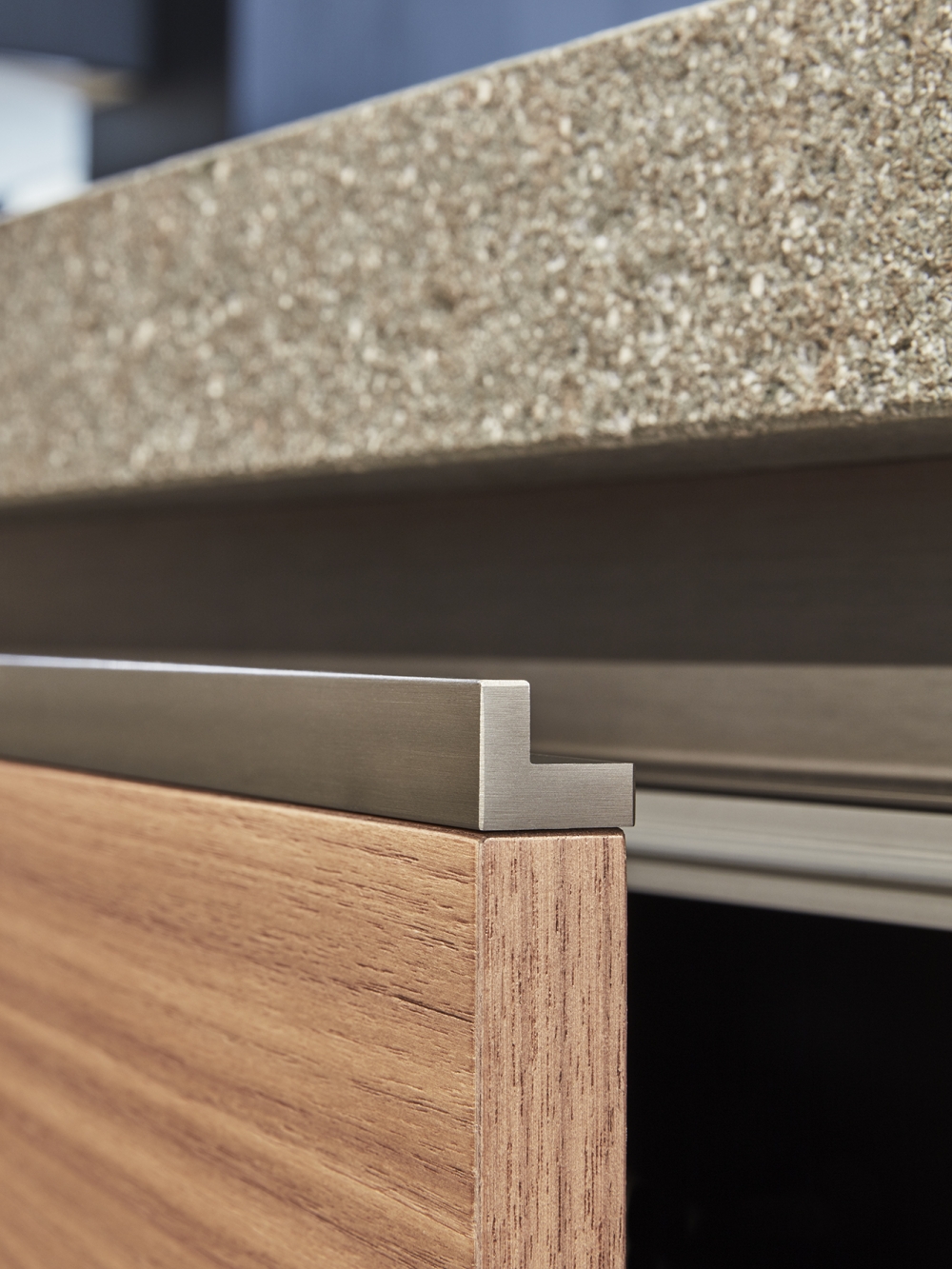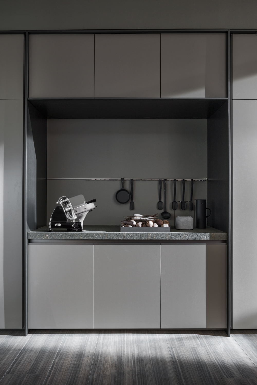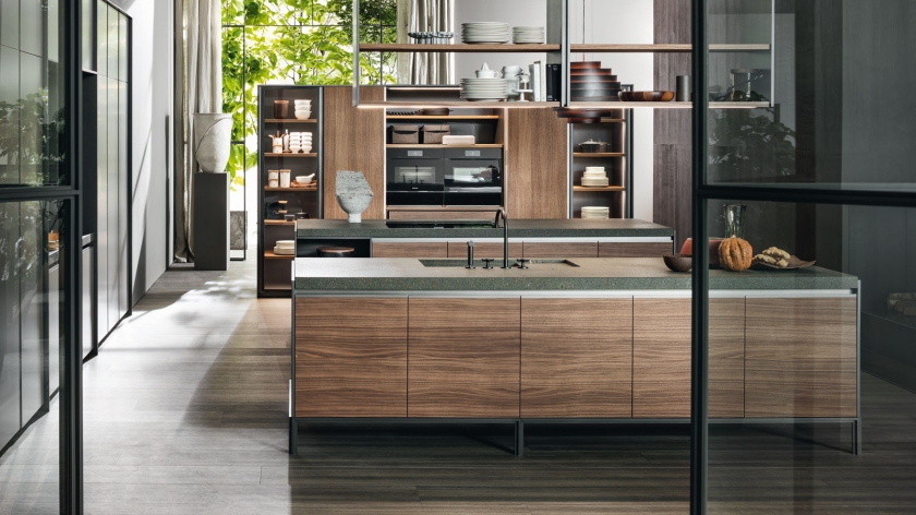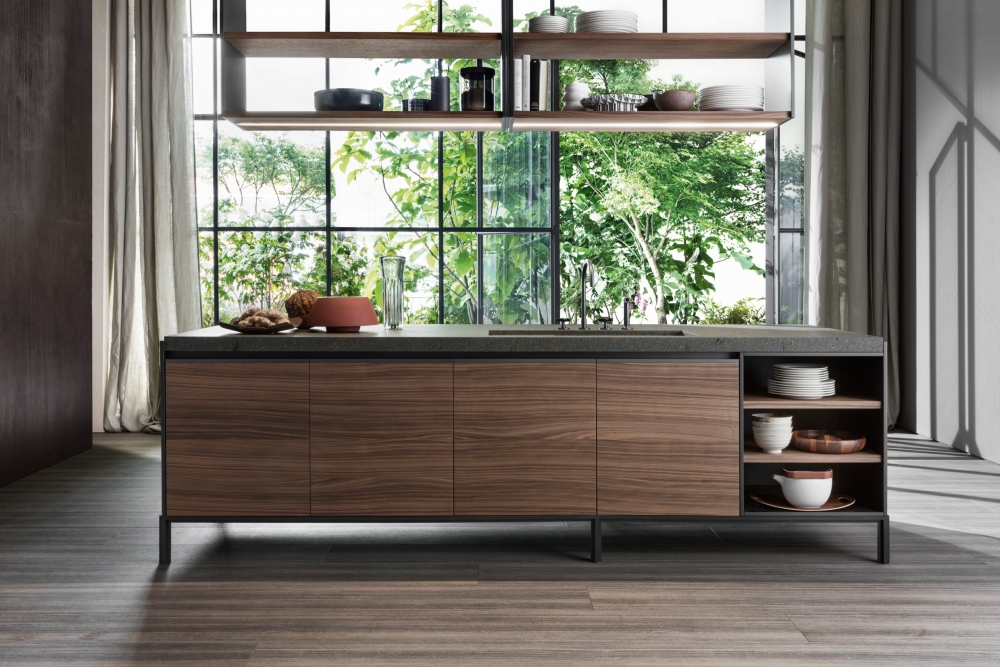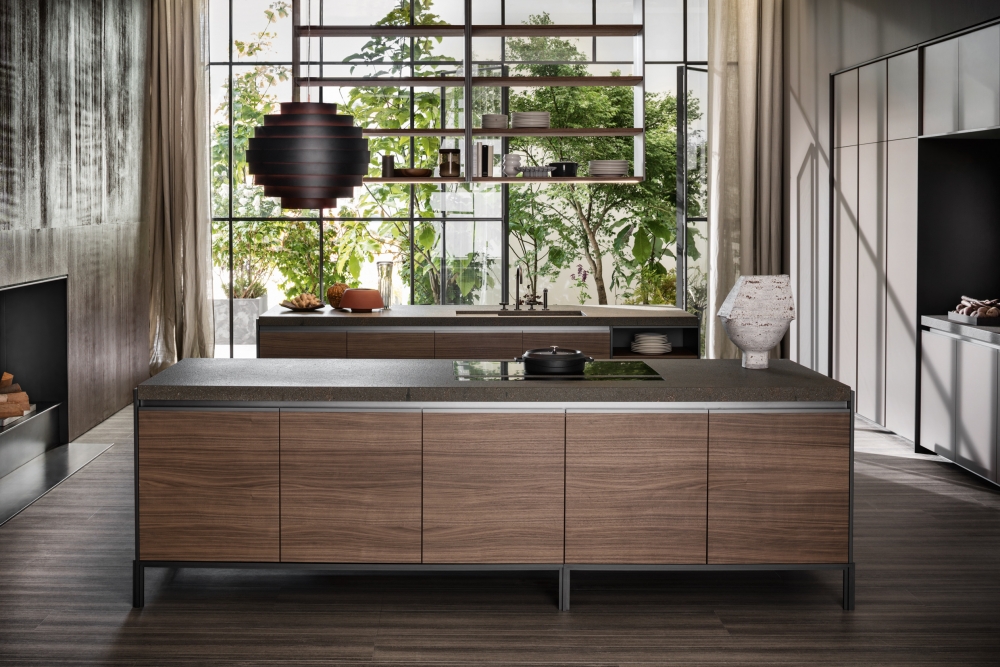 大型的拉出式托盤、日間抽屜和下方平面的集成式小輪完成了整個項目的結構設計。 鋁制的支撐框架可以讓所有的組合物完全貼近地面。創新揭示了集成式欄桿和LED的技術細節,而謹慎處理的柜門優化了抓地力,創新的鉸鏈轉軸可以讓柜門開啟至180°,獲得更多的內部可利用空間。 得益于優雅的懸拱和配備了微型緩沖鉸鏈的修長玻璃,廚房也因此獲得了一種新的飾面。