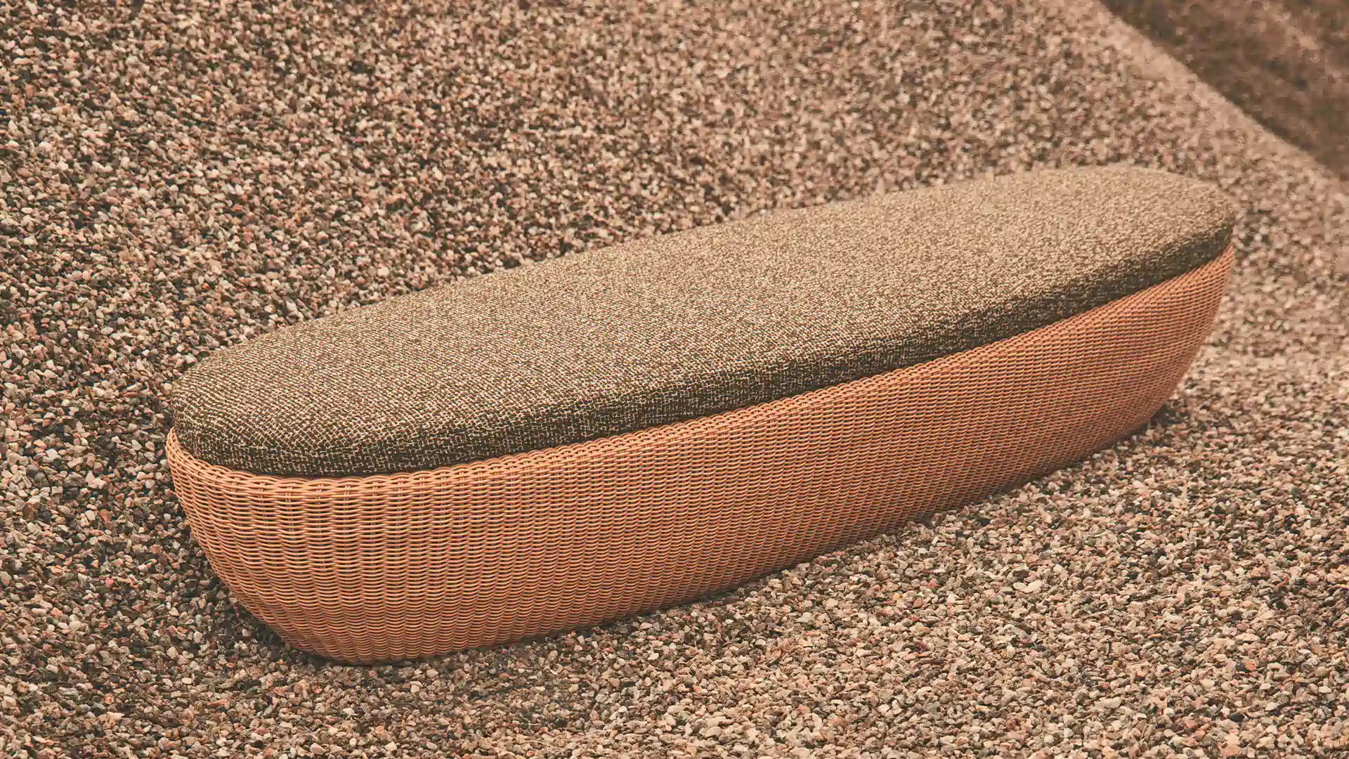 Reminiscent of sunny summer afternoons and the slow passing of time. Afternoons is an outdoor lounge set featuring an armchair, sofa, bench and oval coffee table with a choice of top in Pietra Lavica Smaltata, Pietra Bianco or Grigio Pece. Supported by an outdoor painted aluminium frame upholstered with natural-coloured, hand-woven PVC, the chair collection is padded with cushions in quick-drying polyurethane foam that fit perfectly into the silhouette. The collection is completed by a pouffe with Polimex and polyurethane frame and upholstered with a water-repellent cloth.