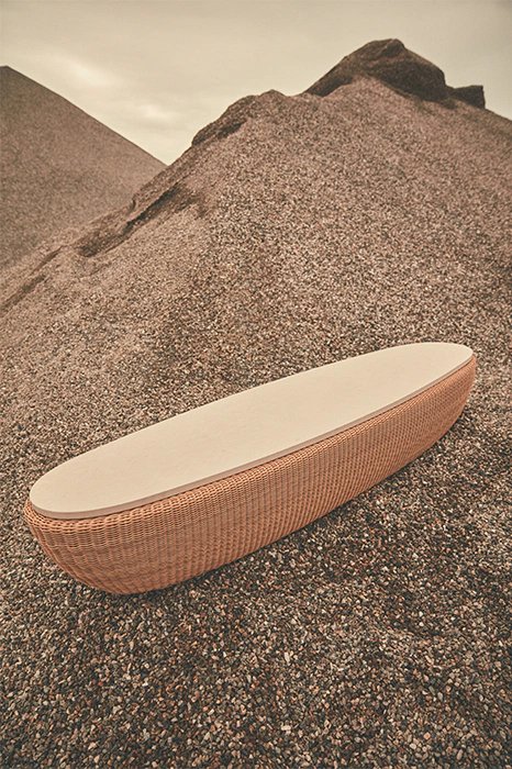Reminiscent of sunny summer afternoons and the slow passing of time. Afternoons is an outdoor lounge set featuring an armchair, sofa, bench and oval coffee table with a choice of top in Pietra Lavica Smaltata, Pietra Bianco or Grigio Pece. Supported by an outdoor painted aluminium frame upholstered with natural-coloured, hand-woven PVC, the chair collection is padded with cushions in quick-drying polyurethane foam that fit perfectly into the silhouette. The collection is completed by a pouffe with Polimex and polyurethane frame and upholstered with a water-repellent cloth.