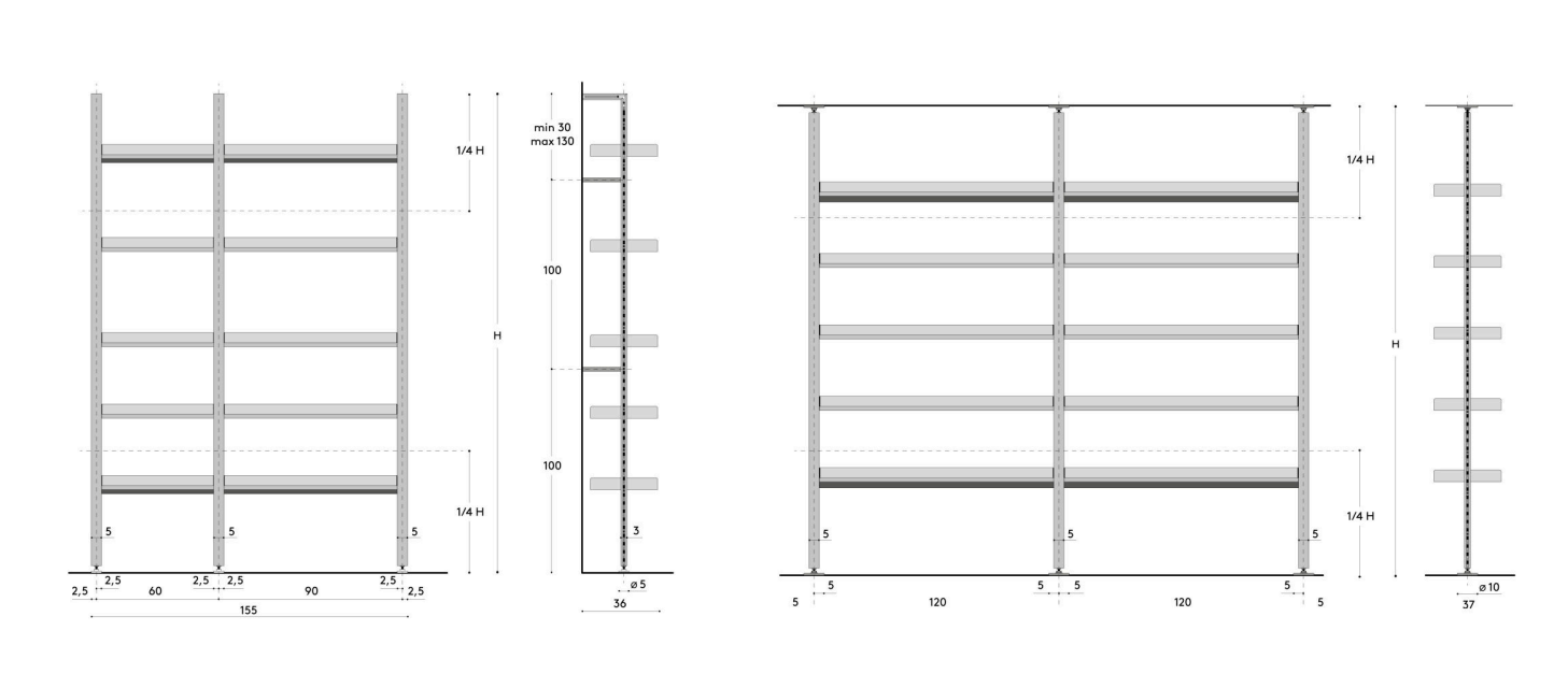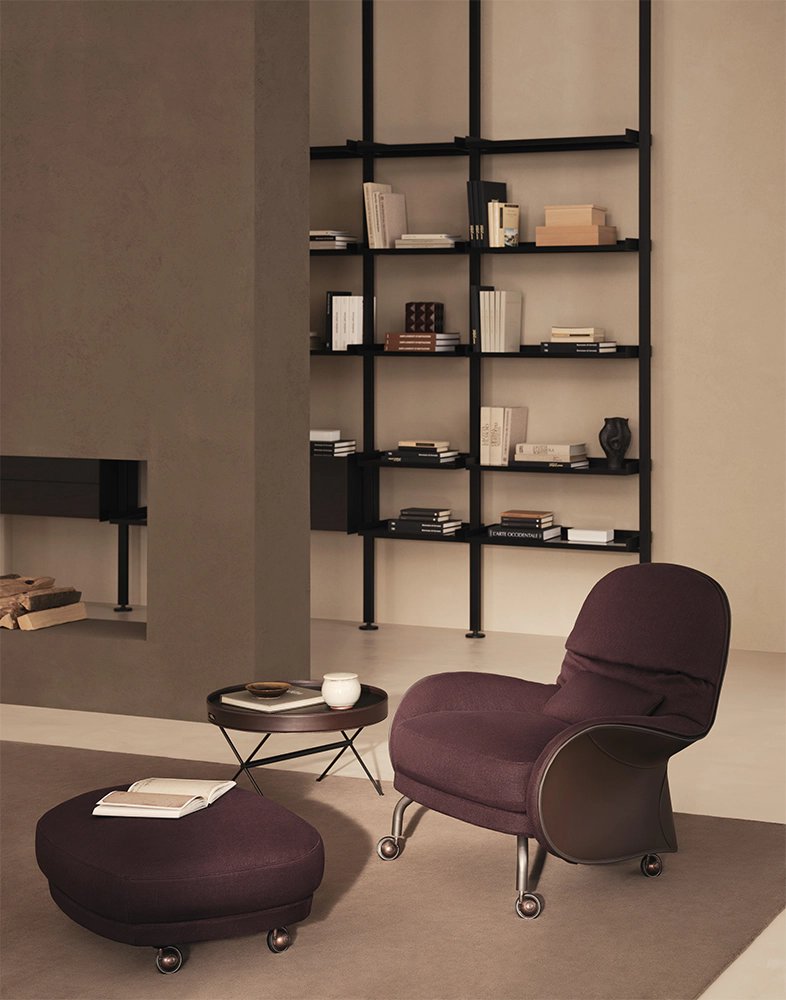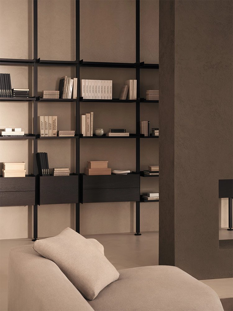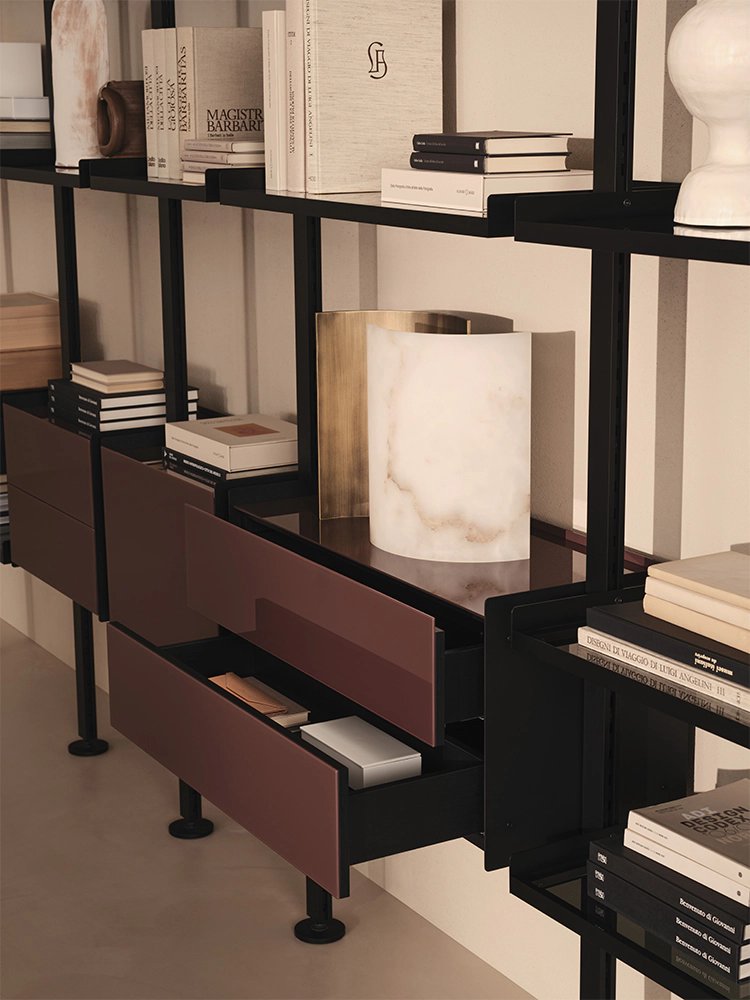 The evolution of functionality. SaintPaul traces out the contours of the Wigmore Shelving System, enriching it with new features and finishes. Three different sizes for the tops made of anodised extruded aluminium and the possibility for pairing with clear glass, Dark Grey, Metropolitan, Garage, Rovere Affumicato. The cabinet modules are available in the two-drawer pull-out version or with flap door in the finishes Laccato Lucido, Rovere Affumicato, Vetro Nero, Rosso Petra.