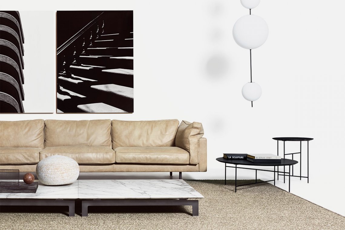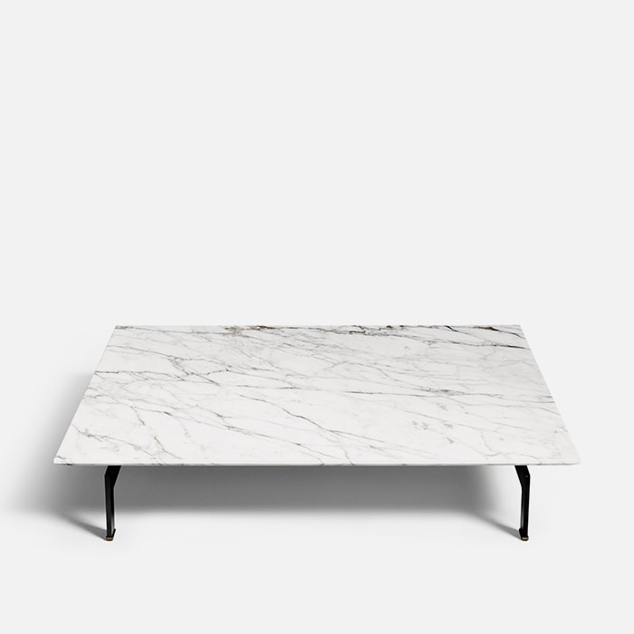They set the mood at home and underline the geometrical shapes of the living room, used at the center of the space in the freestanding version or placed in an intermediate, corner or end position. Flying Landscape accent tables complete and add character to the seating system with the same name. The wood or marble top in a variety of finishes sits on an unpolished gray steel structure with brass feet.