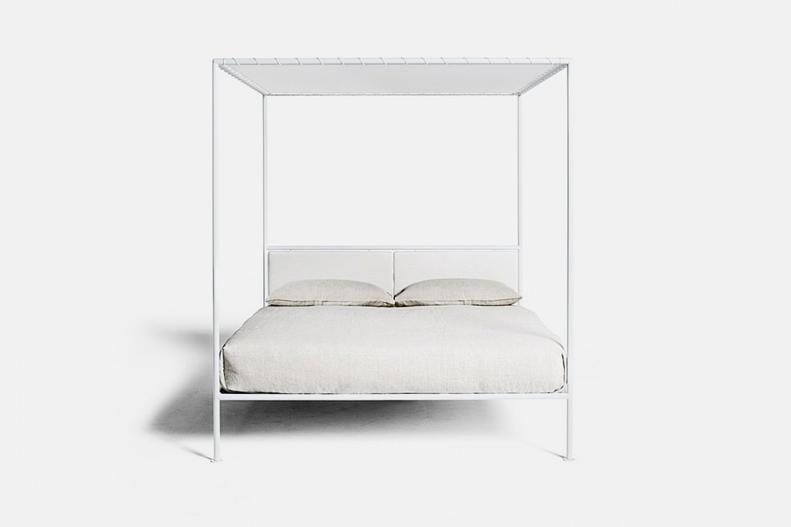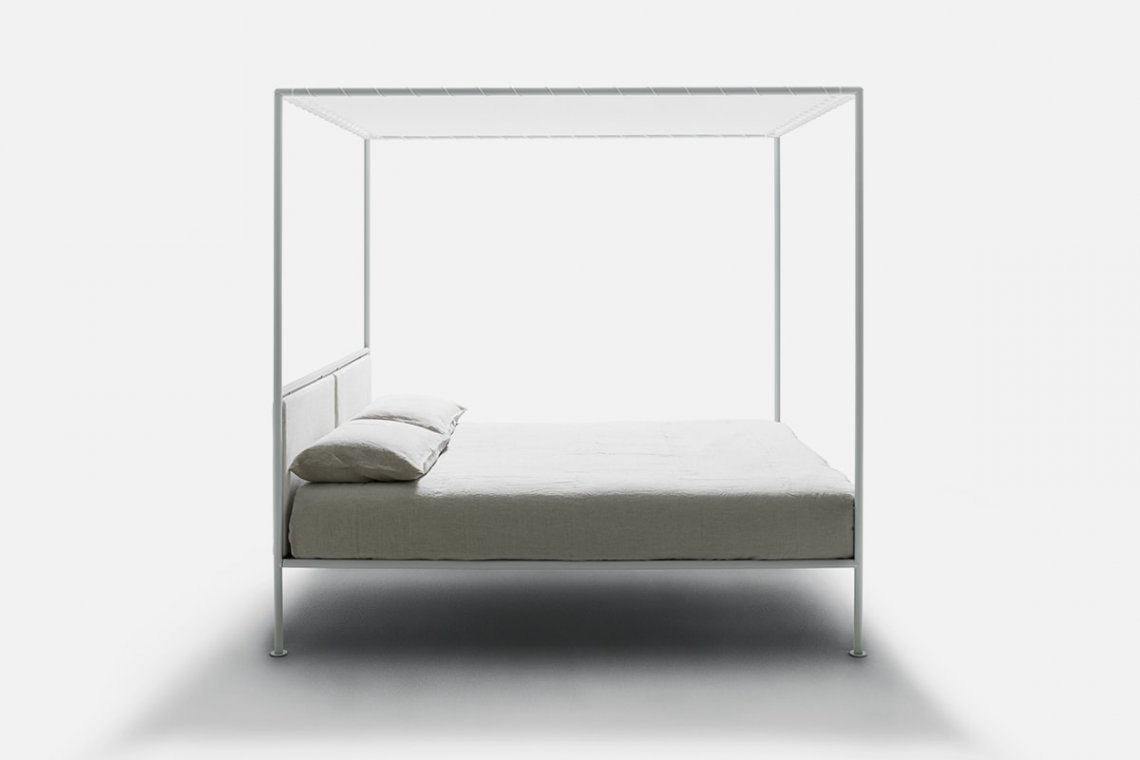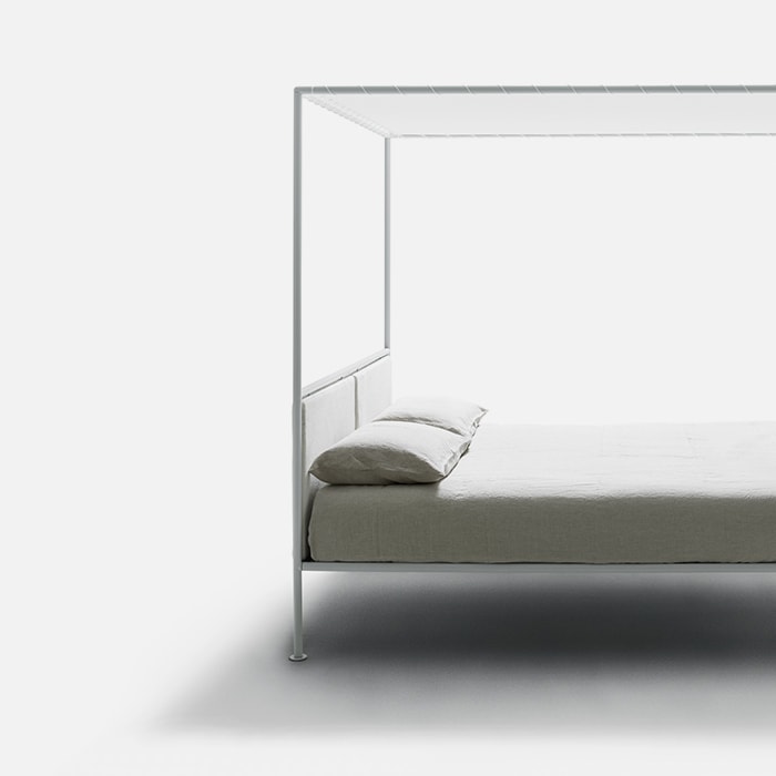 A contemporary romantic, the canopy bed designed by Patrizia Cagliani is light and minimalist with a sentimental soul. The white tubular structure forms a sleek perimeter adorned with a draped tulle mosquito net and a cotton top laced to the frame. A successful balance of different materials, it is perfect for the city but also great for a home in the country or at the beach.