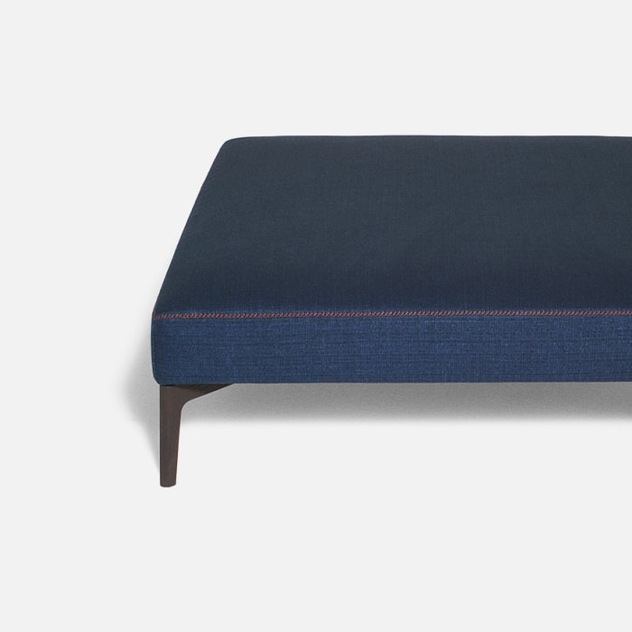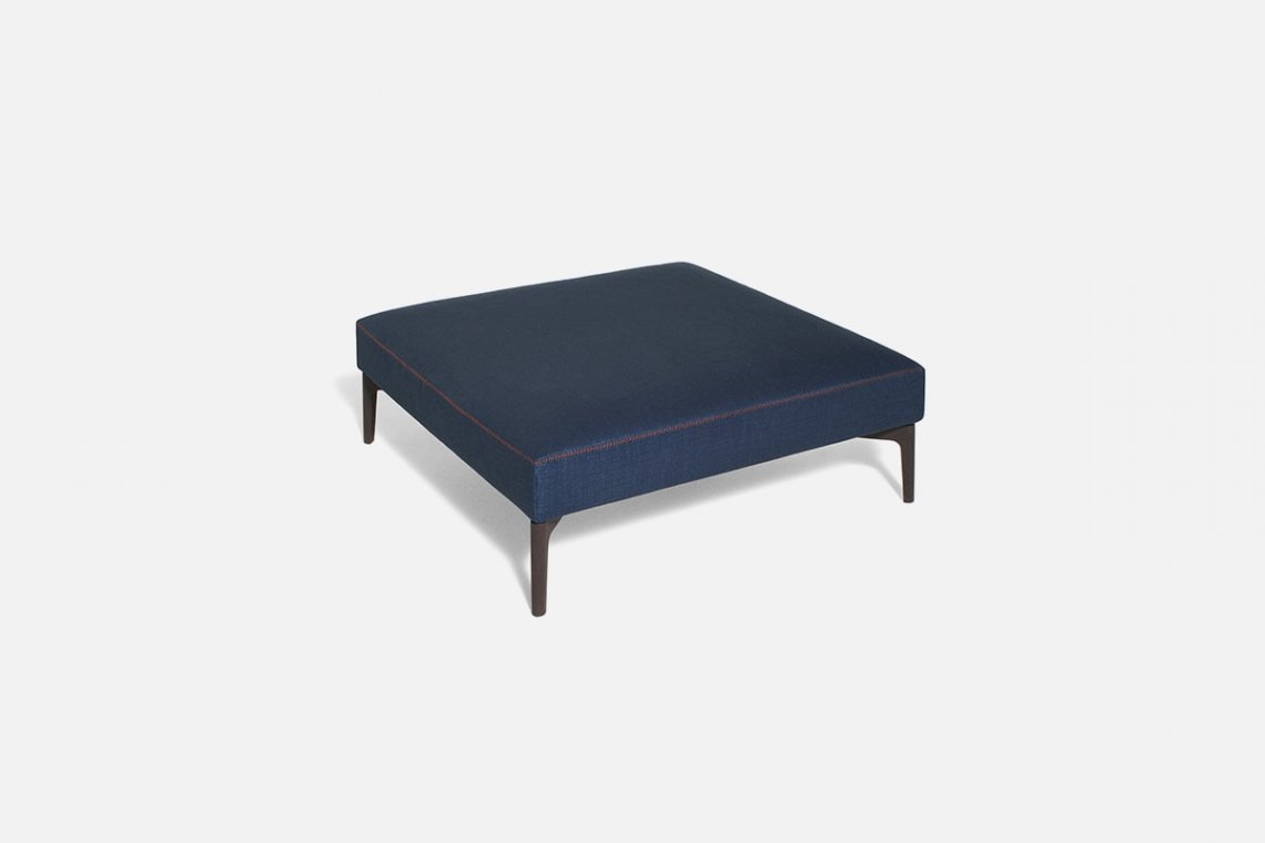 Sofas, armchairs and pouf are marked by contrasting stitching that evoke sartorial know-how.