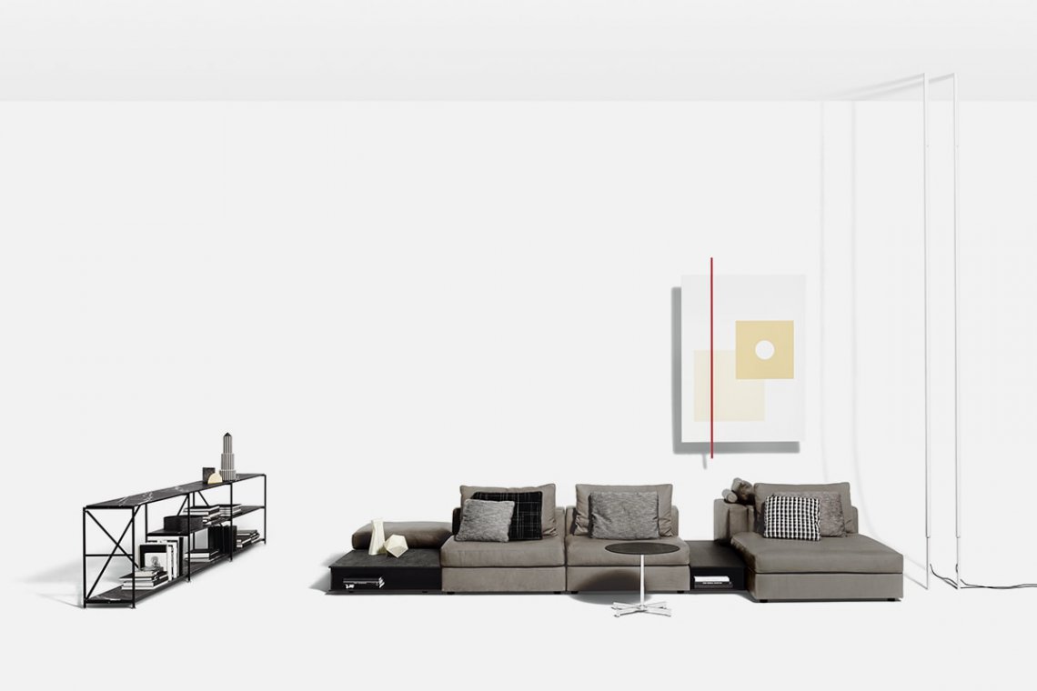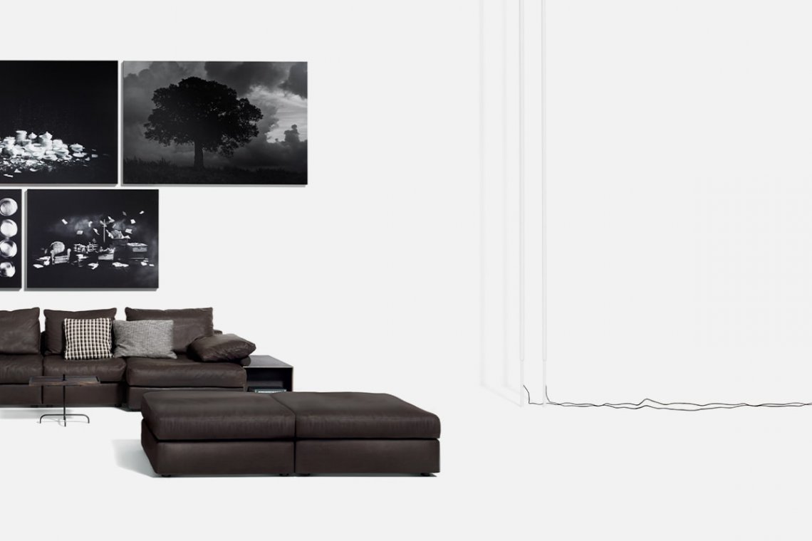 A luminous double line from floor to ceiling distributes light along the entire length of the metal tubes available in matte black or white. These two light sources can be switched on separately or together. There’s no bulk, but extreme versatility: turn it on its axis and the lighting completely changes in the space.