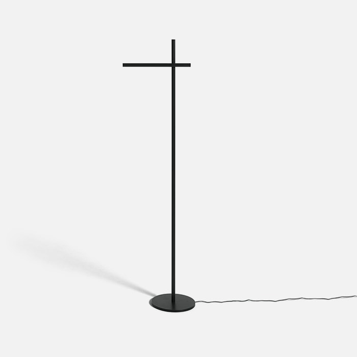 Proceeding by subtraction, with perfect formal balance, the floor lamp by Japanese designer Keiji Takeucki sheds light in the asymmetrical intersection of two matte black aluminum tubes. Very clean in shape, functional and discreet, it has a diffuser that can rotate around its axis to illuminate wherever needed, without impediments or frills.