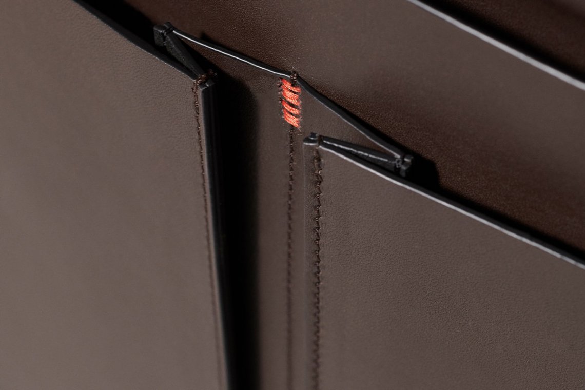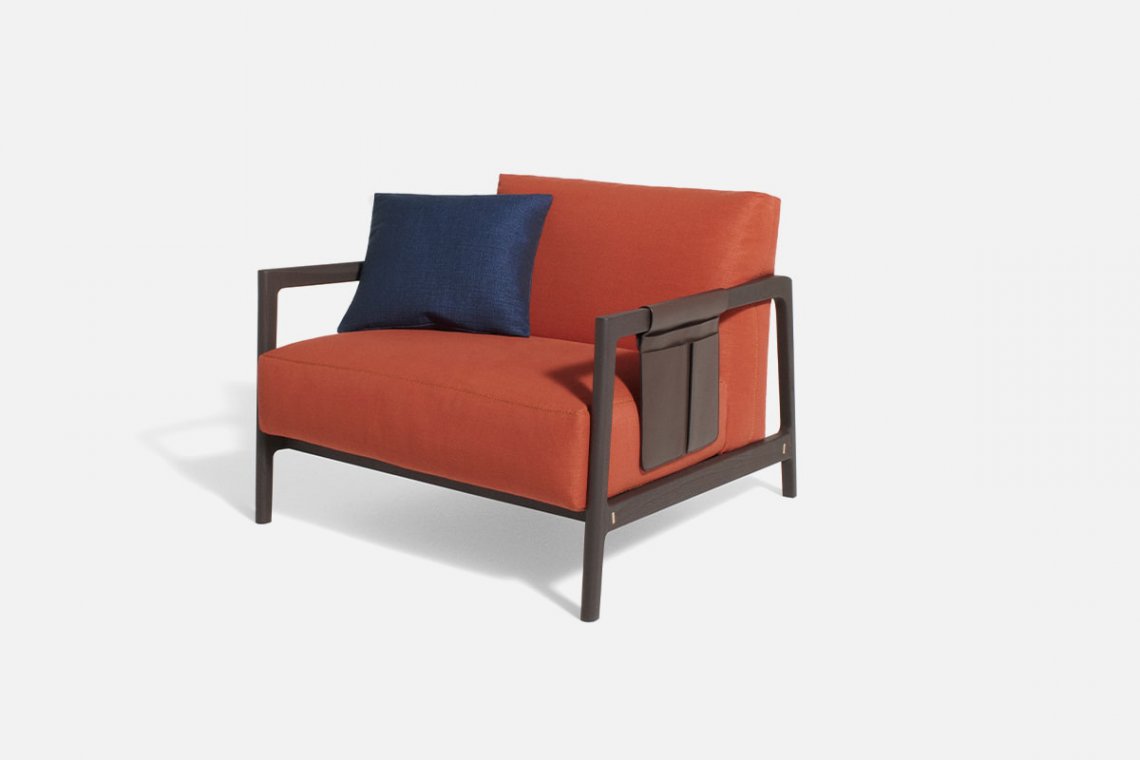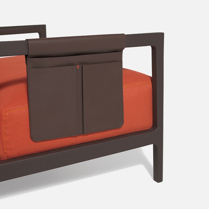 The large and useful leather satchel is designed to be paired with the armrest of the armchair or the sofa. It can contain the magazine, the remote, the reading glasses, a book. Everything that is necessary to relax.
