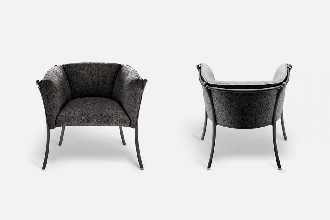 A gently curved and slightly open line defines Smeralda, the armchair designed by Anna von Schewen with a light retro look. The padded seat and back create a protected space. The matte anthracite gray painted steel structure is sleek and comes with contrasting elasticized cords. Solid and well-balanced, it is versatile and functional.