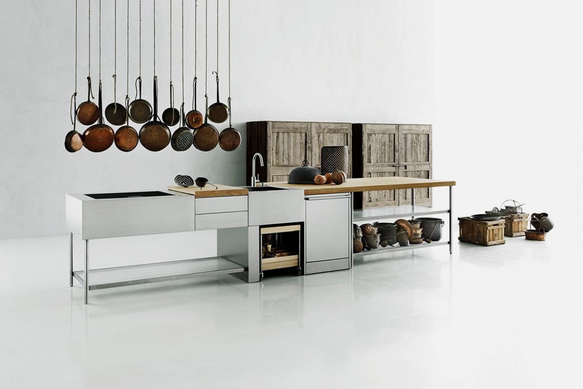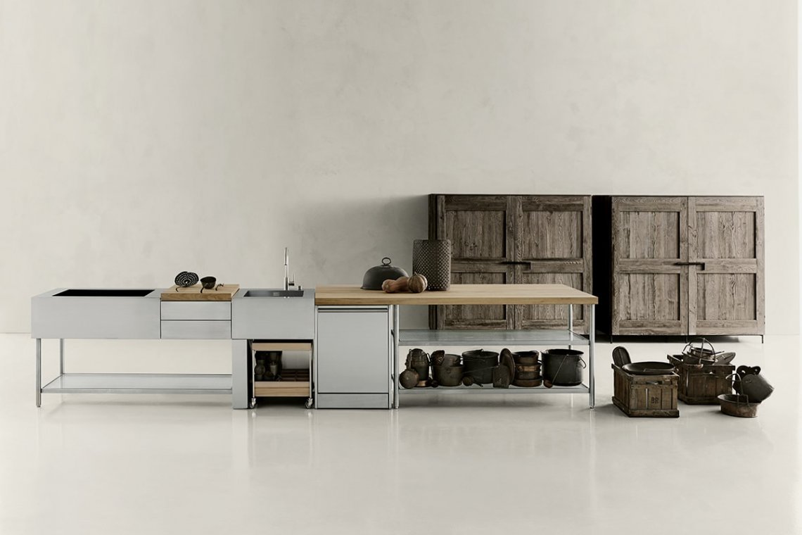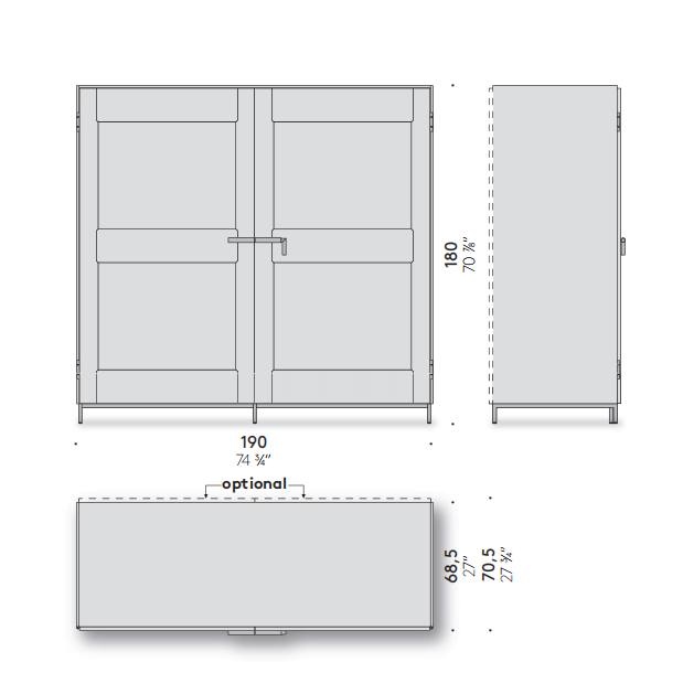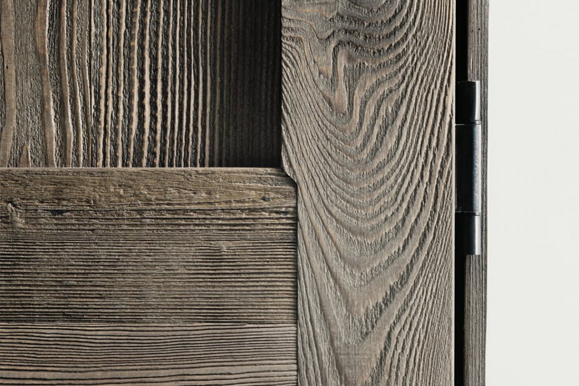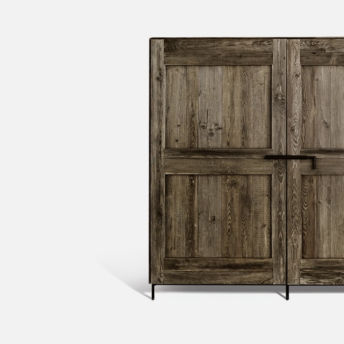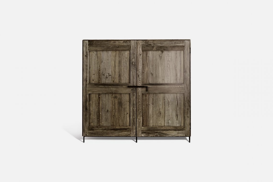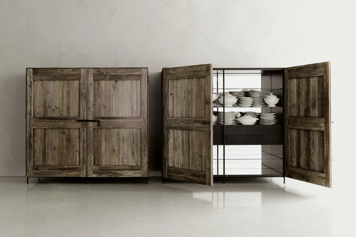 With two large framed doors in solid fir naturally aged for a warm and vibrant appearance, this simply elegant creation by Piero Lissoni meticulously pays attention to every detail: exposed burnished metal hinges, an interior lined with mirrors and glass shelves, and a LED light bar that illuminates the space when the doors open.