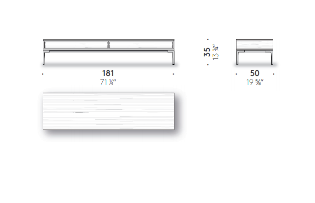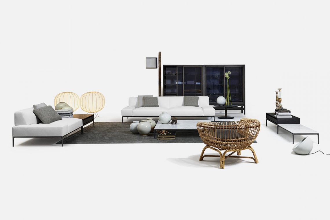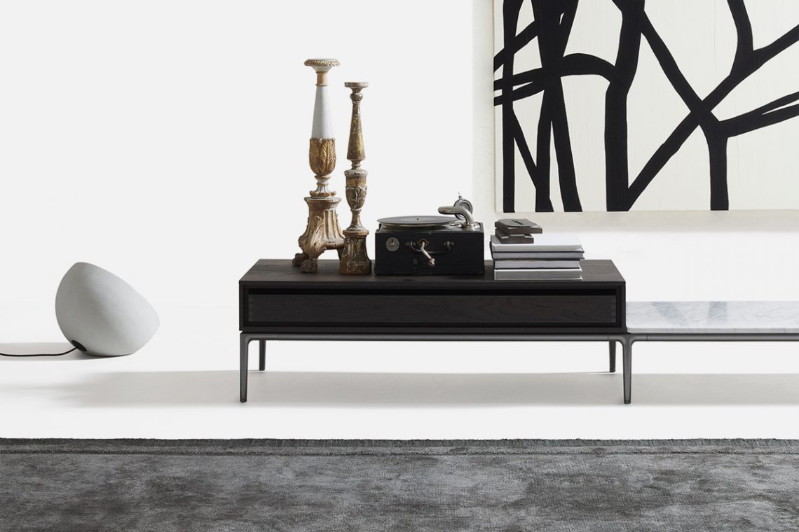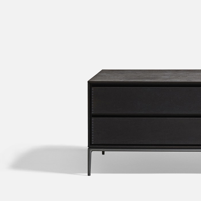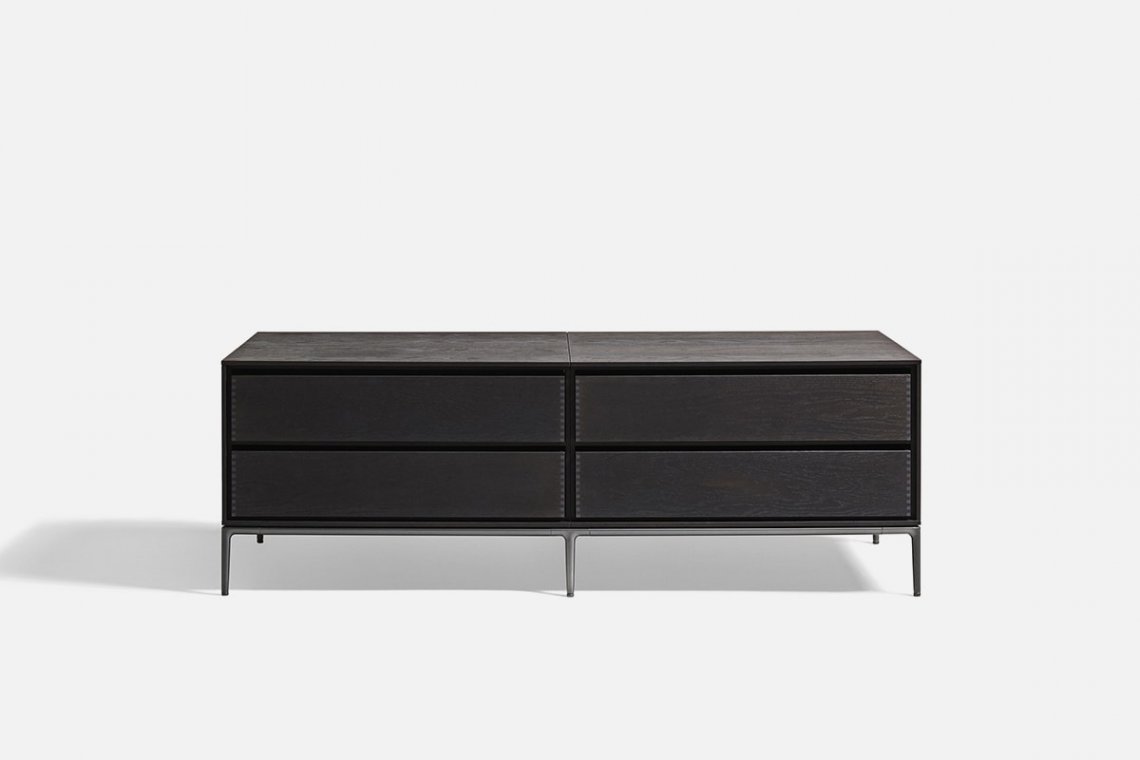 Horizontal Cabinets ēdition is the 2021 extension of the design previously seen with Horizontal Sofa ēdition, a piece developed by Japanese furniture brand Time & Style. Entirely made in Italy, the project includes a series of elements marked by straight, square and geometric lines and is composed of a system of containers with drawers and open compartments in smoked oak that incorporate the outlines of the seats.