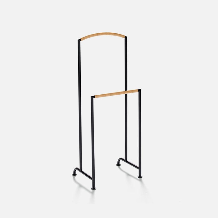 A contemporary version of a classic. The valet stand designed by Annette Lang is quite simple: black tubular steel covered with natural leather cord where clothes might slip. It’s perfect in the bedroom, where you need something practical for hanging things.