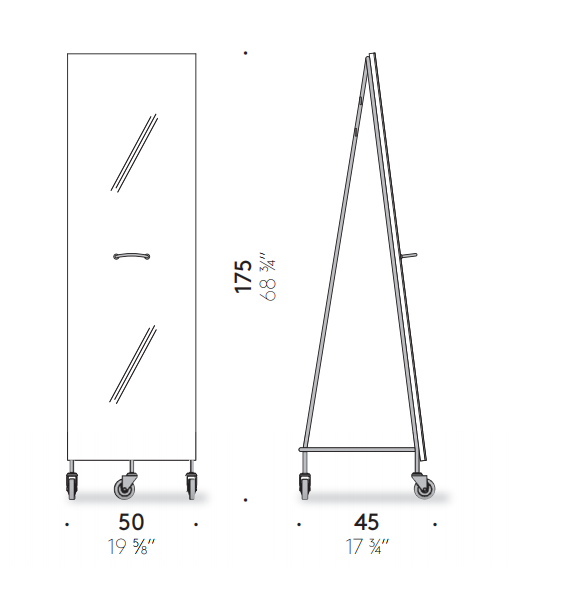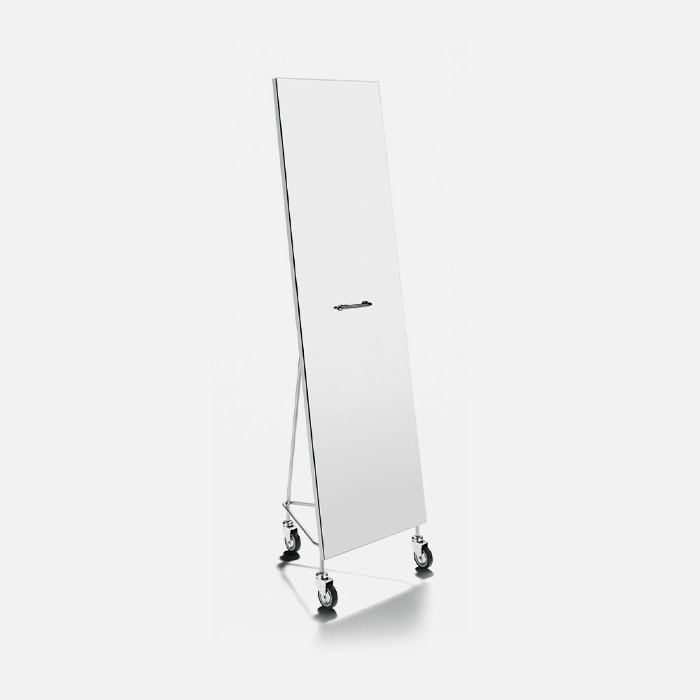 The Narciso mirror moves on three wheels and comes with a handle at its center that makes it easy to move (while the triangular base ensures stability). The frame has several coat hooks for hanging clothes, accessories or a quick change.