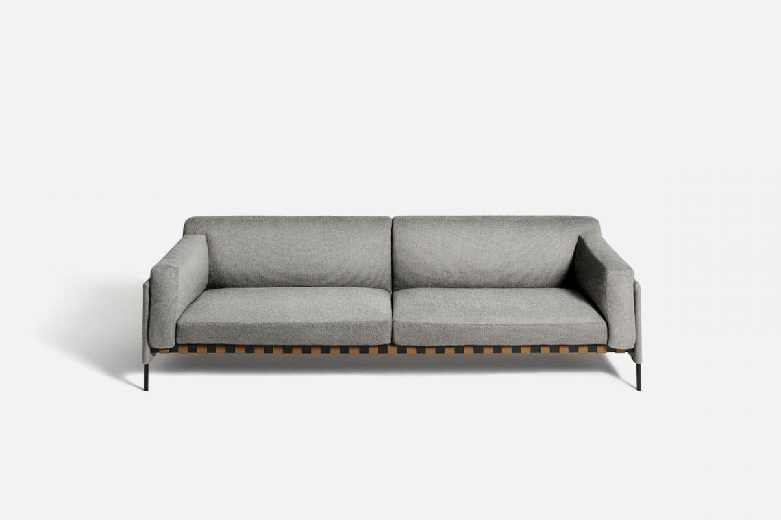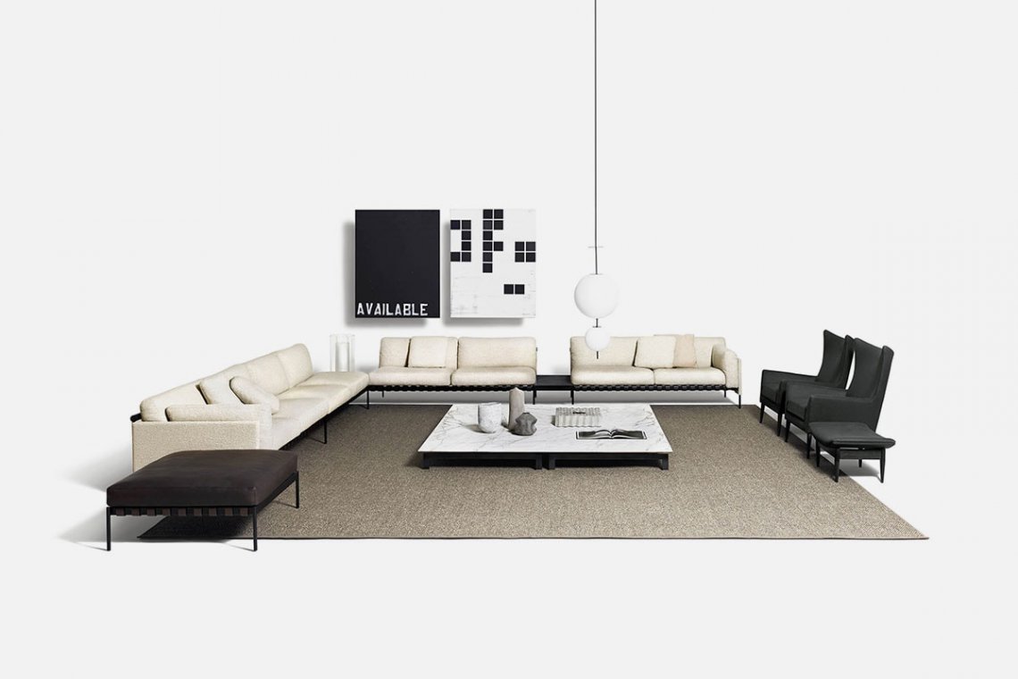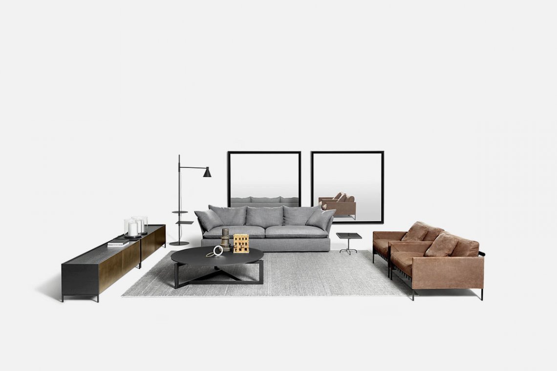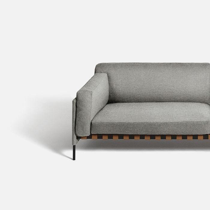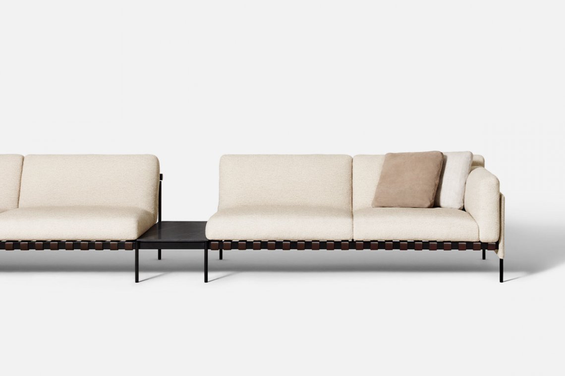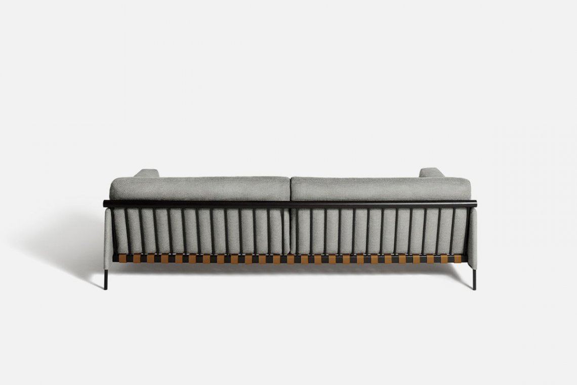The Scandinavian-inspired structure dialogues with outstanding Italian craftsmanship. The étiquette project, which includes a sofa and pouf, is by the GamFratesi duo. A regular and cohesive matte black steel frame is completed with leather straps and a charcoal-colored ash wood bar. The atypical construction makes it an excellent solution for defining spaces, also thanks to the stunning back view.