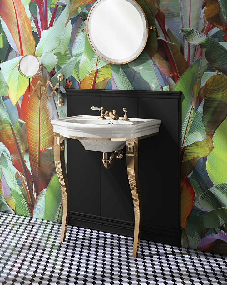 The curved form of the legs emphasizes the essence of the eighteenth-century sinuous lines and revisits them in a light contemporary spirit. Made of fused aluminium with turned brass elements, the bearing structure is available in chrome, light gold or polished nickel finishes. It is completed with the New Etoile porcelain basin.