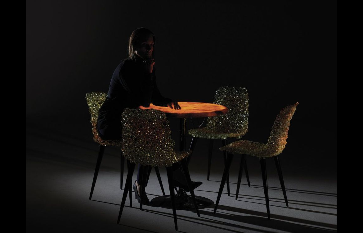 A table in alabaster obtained by cutting a very thick slice out of the egg-shaped extremely pure matter lit from within.