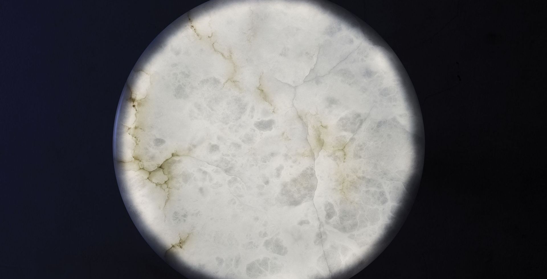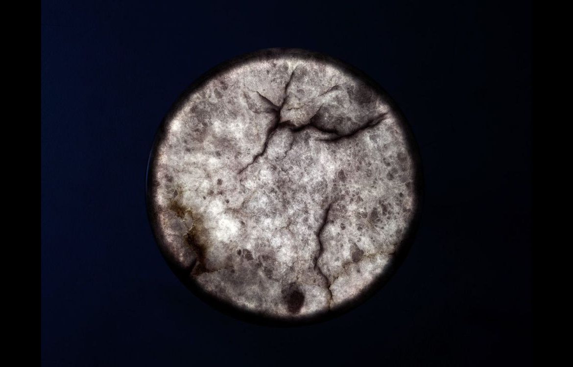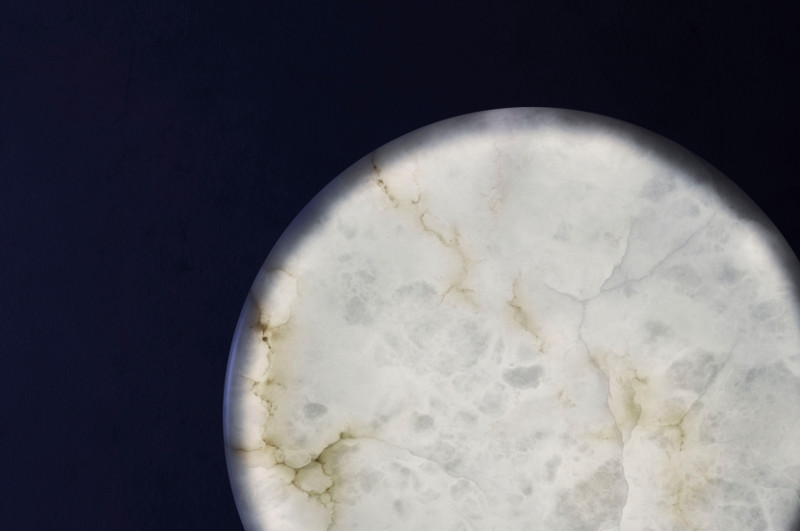 The translucent stone is supported by a shiny metal pedestal and, illuminated, it recalls the full moon.