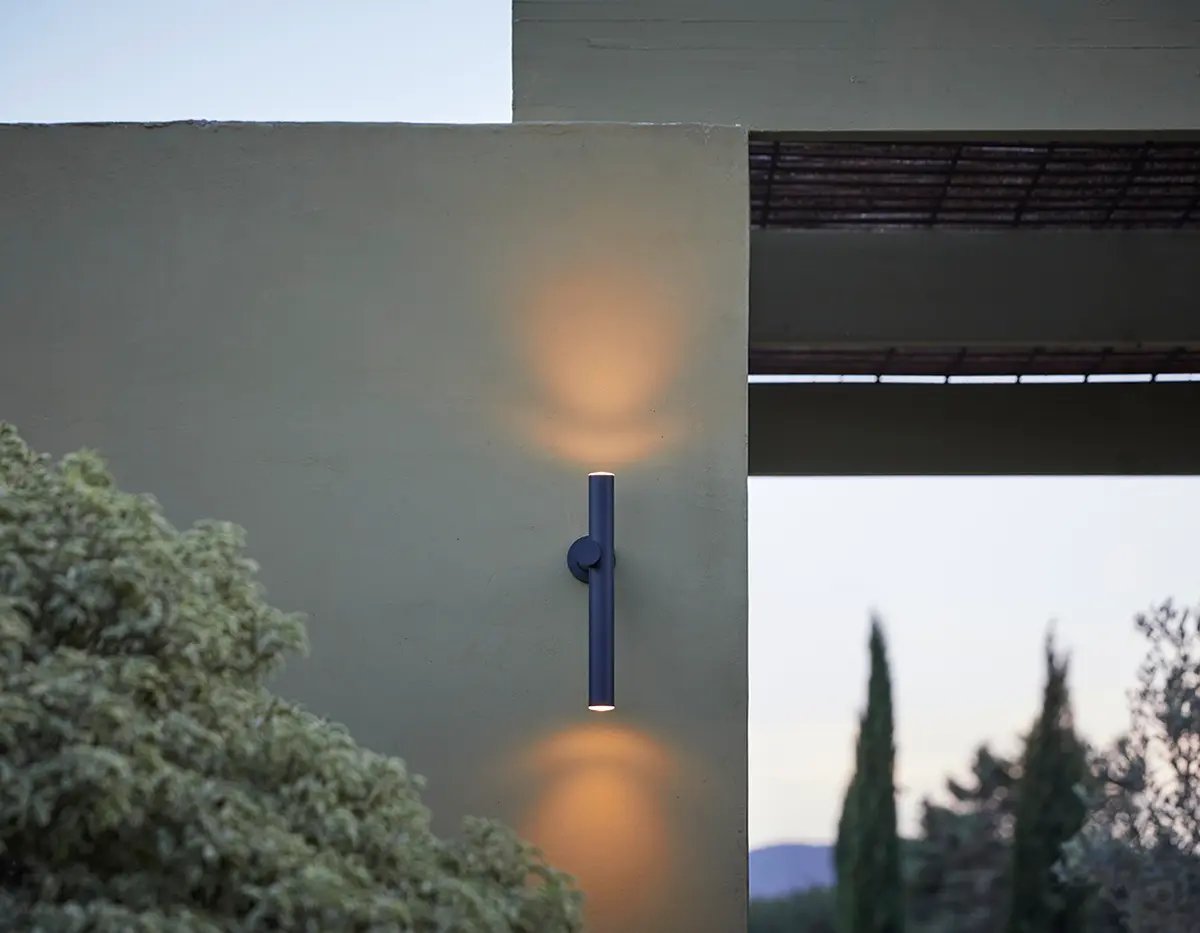 Metallic outdoor wall light. Integral LED providing direct light.