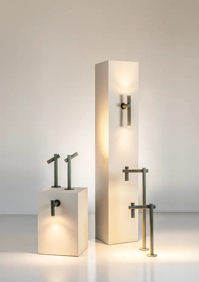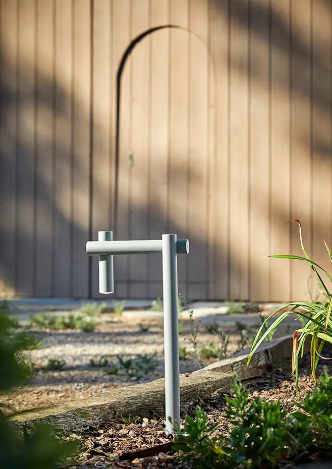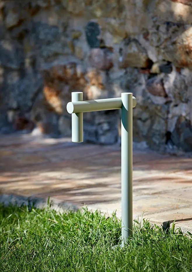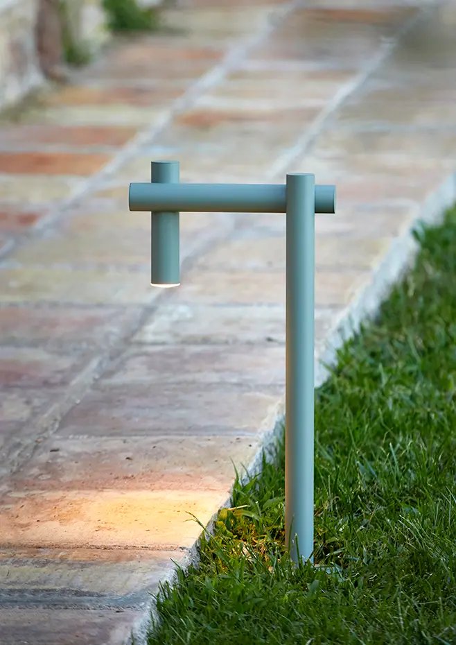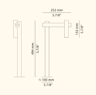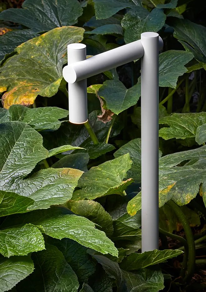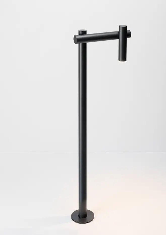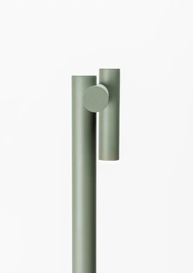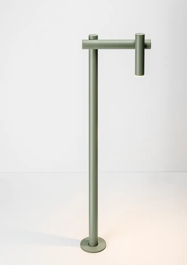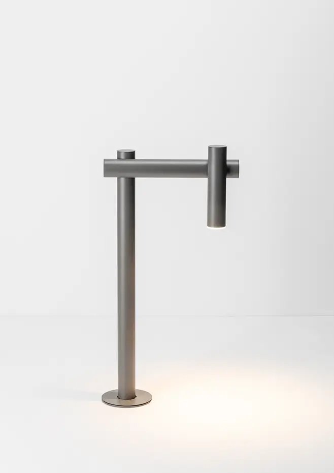 Metallic outdoor bollard light. Integral LED providing direct light.