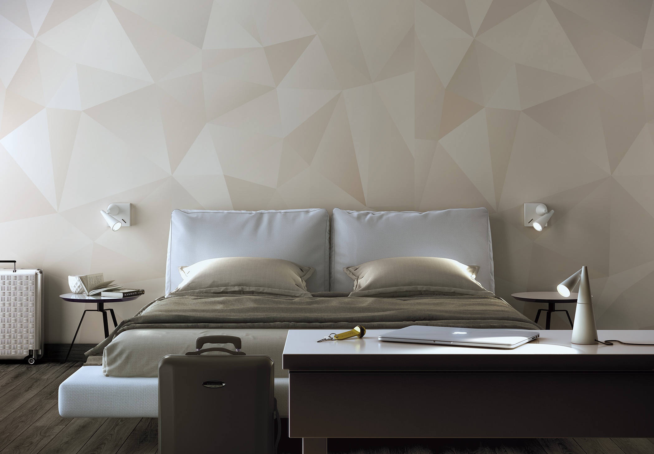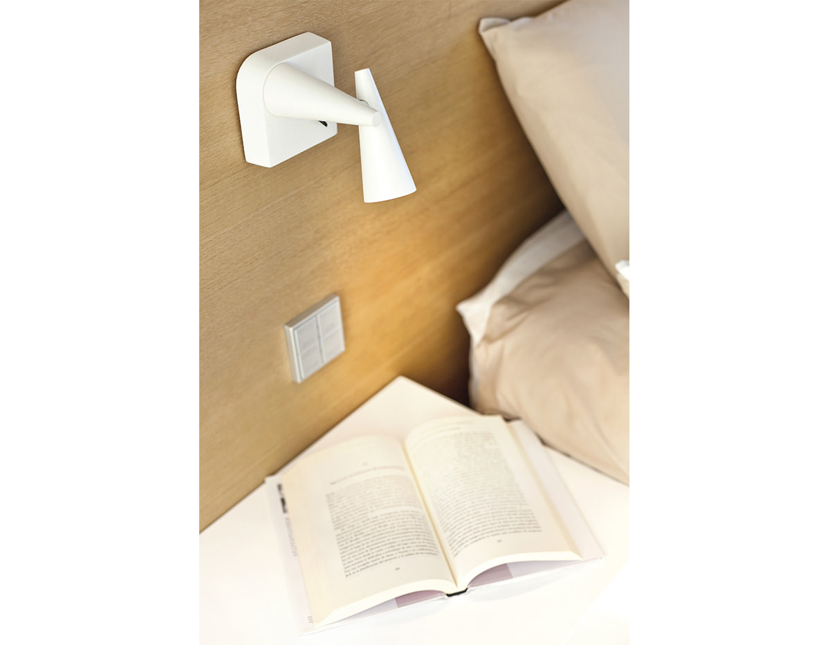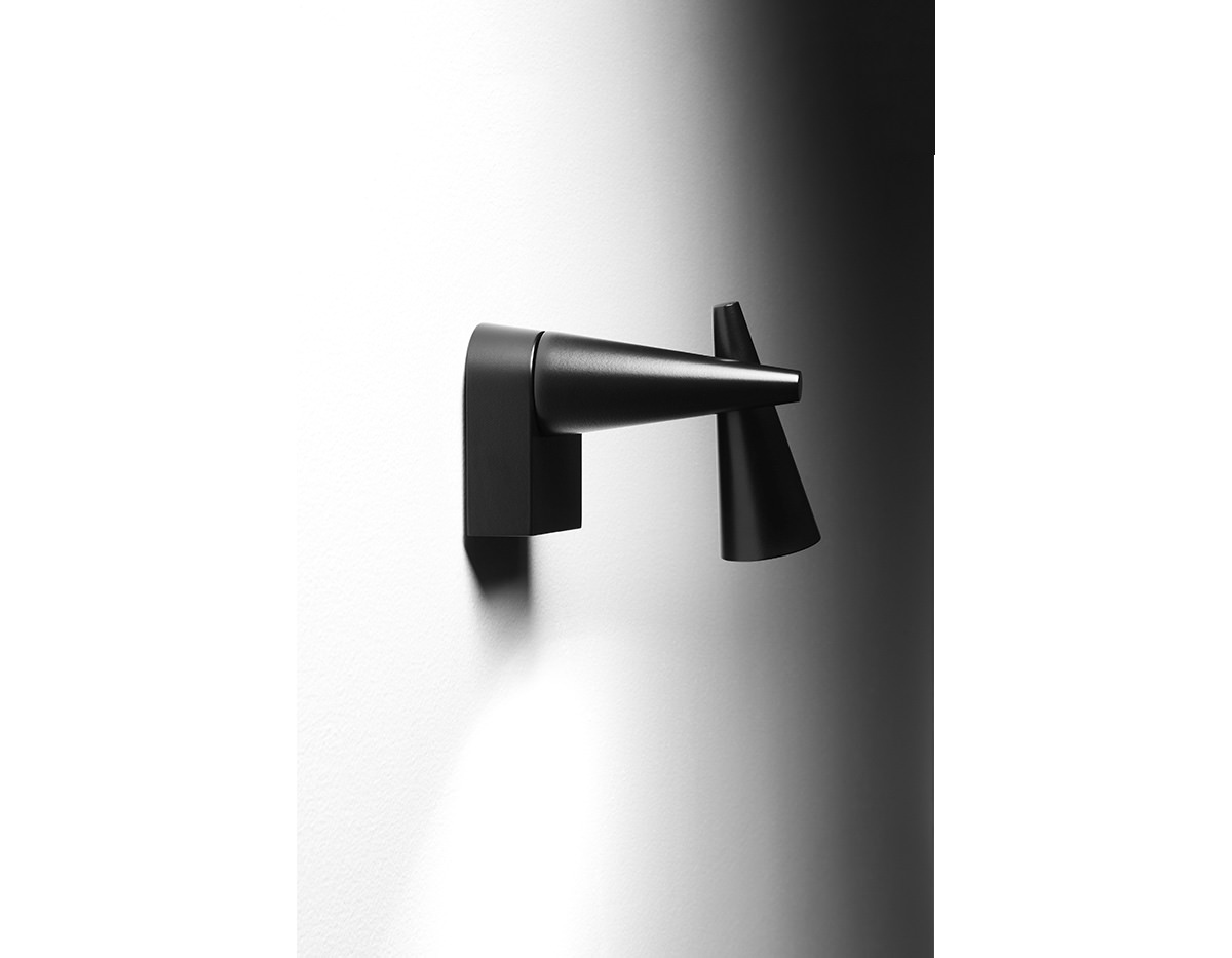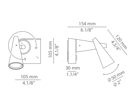 Metallic wall lamp with adjustable rotating conical head. Integrated LED and on/off switch.