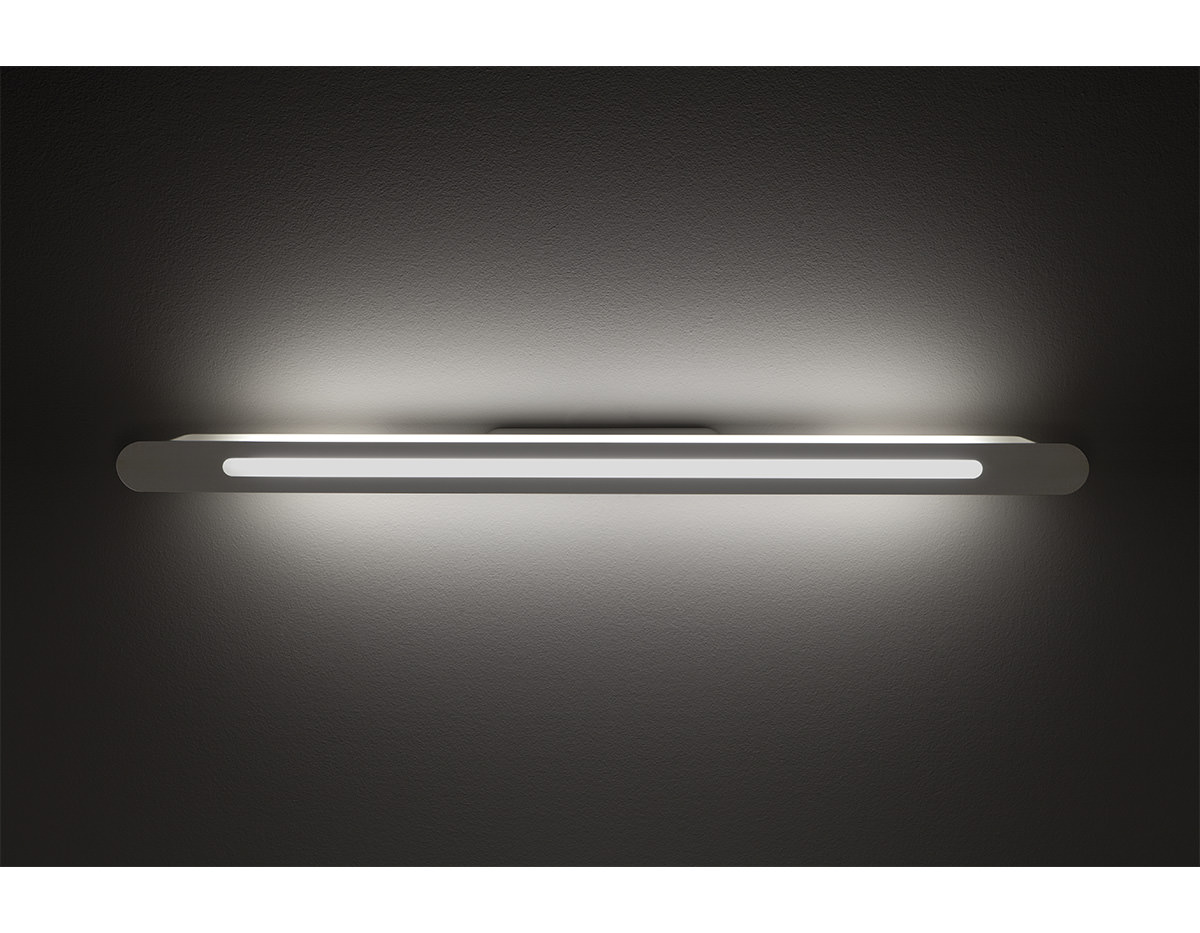 Metallic wall lamp with fluorescent light, compatible with LED bulbs. Front plate with additional cut-out for brighter direct light and acrylic diffuser. It can be mounted vertically or horizontally. The front plate allows laser-cut signage with custom creations including ideograms, logos and texts.