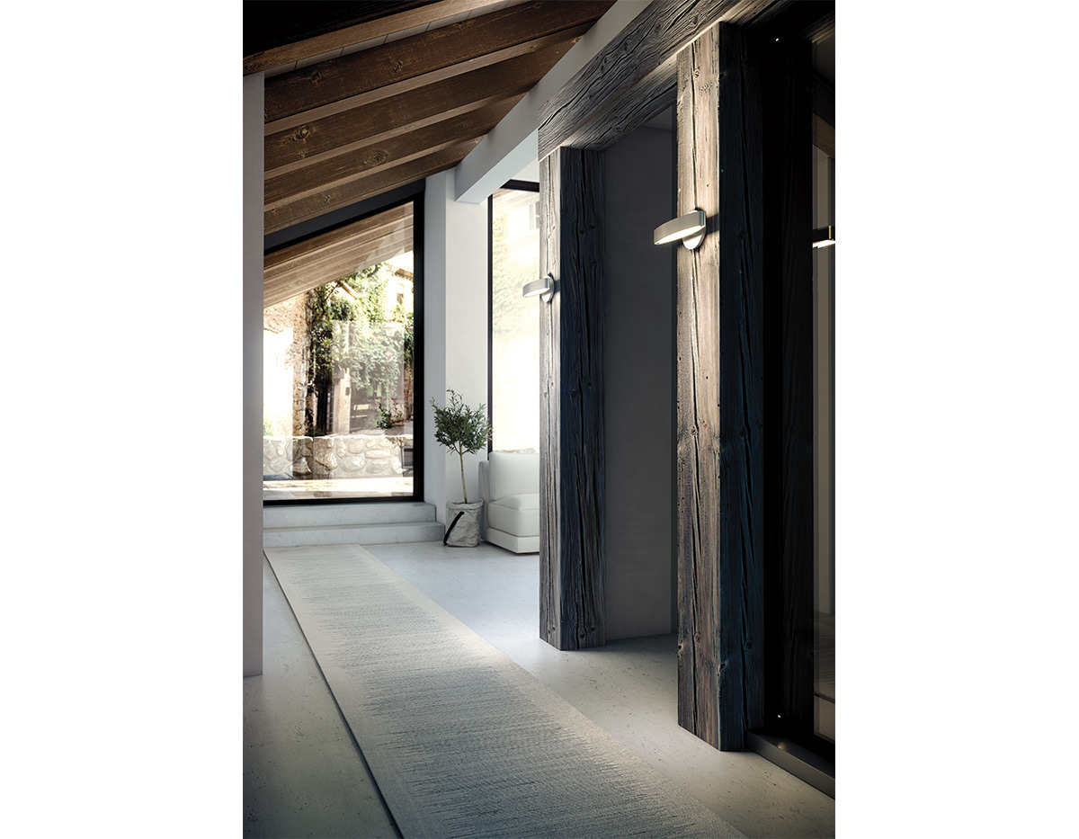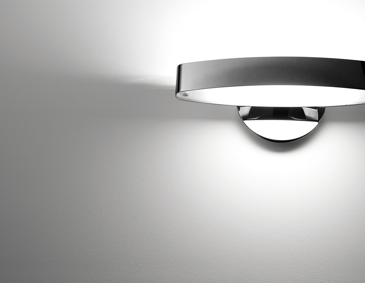 Metallic wall lamp providing halogen direct and indirect light, compatible with LED bulbs. Bottom opal glass diffuser.