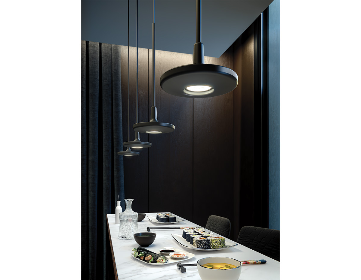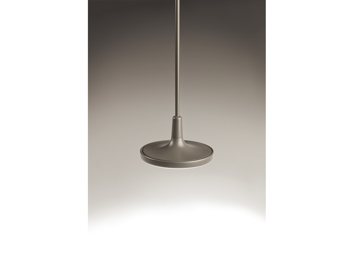 Metallic suspension lamp with aluminium shade and integrated dimmable LED. Adjustable height and individual canopy, suitable for creating compositions.