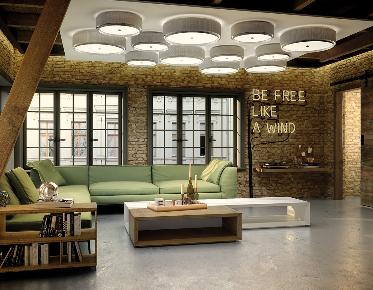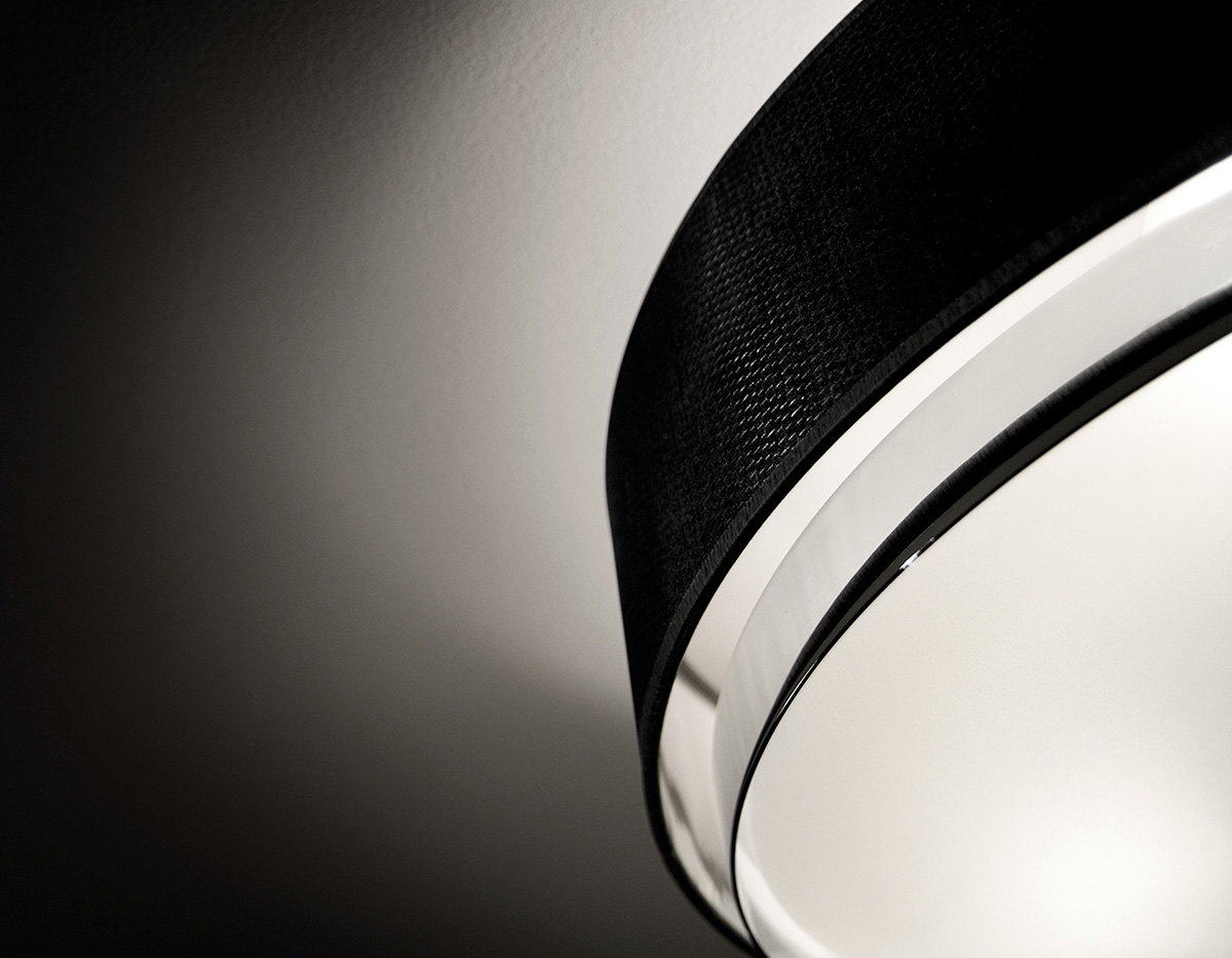 Metallic ceiling lamp providing direct and indirect light. Shade made of polyester fiber protected by a PVC coating with two different diameters. Glass diffuser and polished metal ring on the bottom.